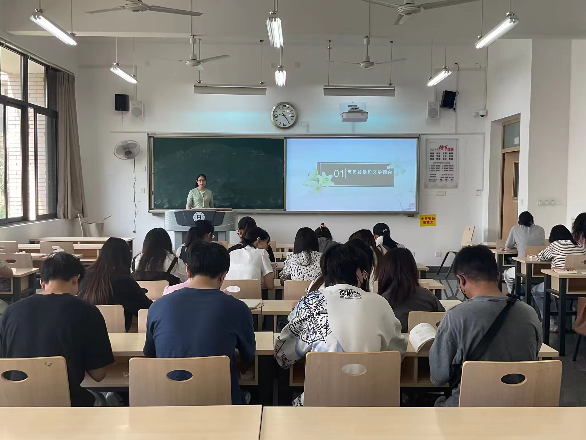 文艺学教研室青年教师讲课质量提升活动持续进行。4月20日上午10点,在明德楼A区307教室,文艺学教研室余霞老师的讲课在员工的期待中展开。余老师的讲课主题为“魏晋六朝文论的历史背景和文学倾向”,课程讲述从佛学东渡、玄学兴起、建安风骨、山水清音等方面展开,余老师讲课视野开阔,逻辑性强,课件制作精美,课后耐心回答员工问题。整个课堂讲述深入浅出,令员工们受益匪浅。课后教研室同仁与余老师进行了交流,肯定了她知识扎实、条理清晰等优点,同时大家主要从板书设计、课堂互动方面的不足进行了交流。余老师诚恳虚心地接受了大家的意见和建议,表示在以后的教学中更加努力,精益求精,以达到最好的教学效果。