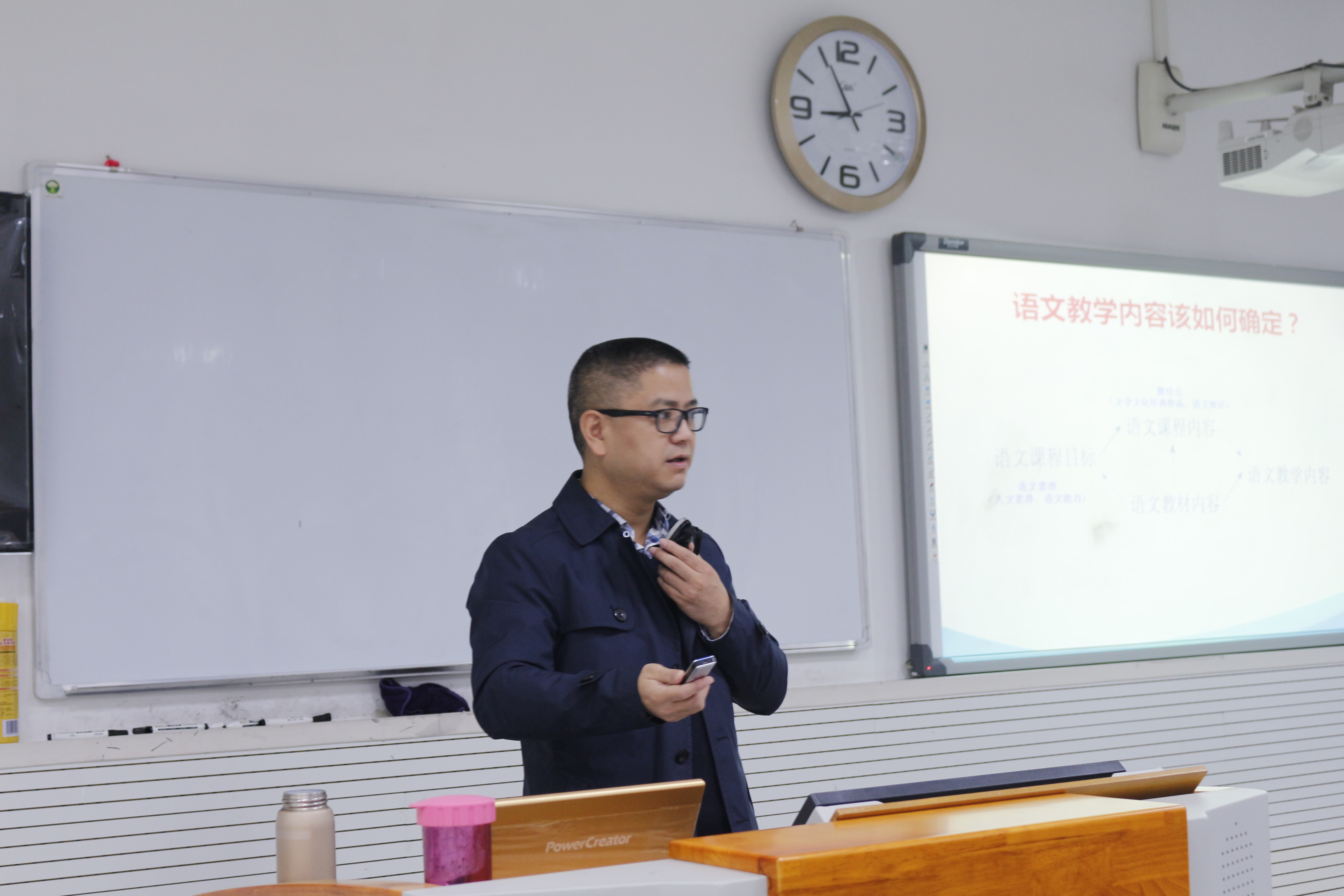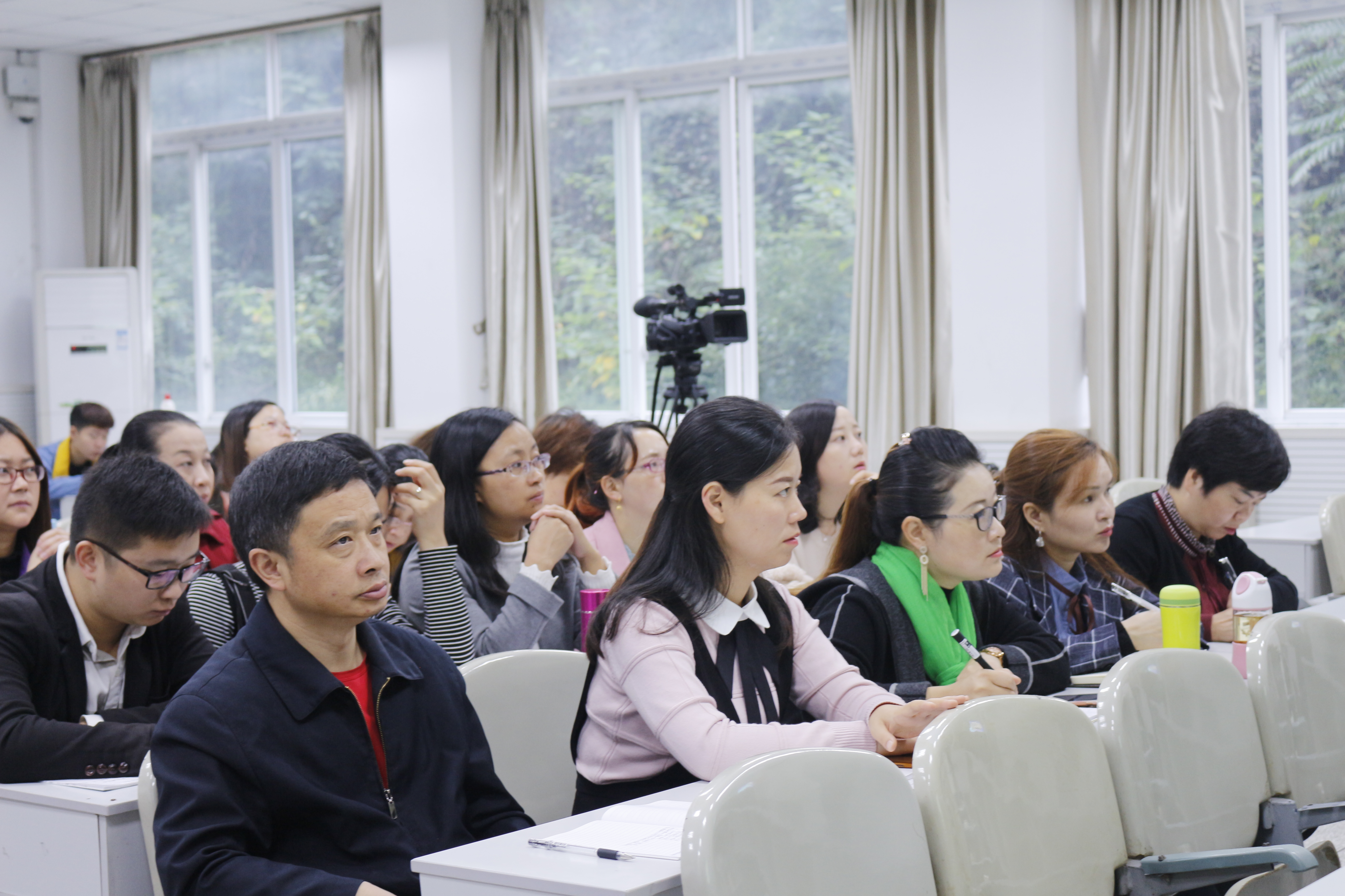 2018年10月14日上午,重庆人和街小学特级教师刘小波莅临公司,于第五教学楼北202多媒体室开展了“指向语文核心素养的阅读教学”的交流讲座,国培小学语文组全体教师参加会议。