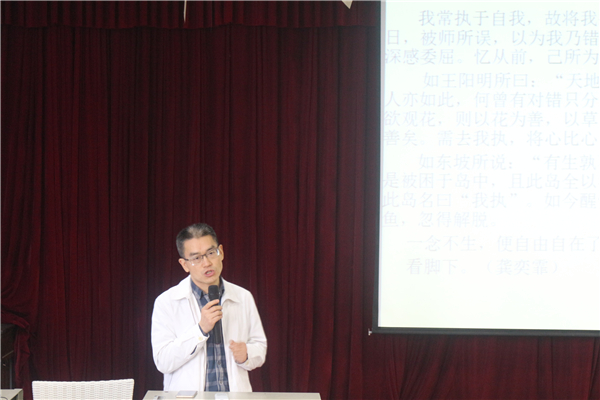 讲座伊始,刘川江老师向学员们介绍了此次讲座的主讲人——周鹏老师,他曾被历届员工称为“重庆一中的标志性建筑”,从事教育行业多年,在语文教学方面颇有建树。随后,周鹏老师上台开始讲解,提出语文的核心是古诗文素养,他以小升初员工的优秀佳作来说明教师很容易低估员工对古诗文的接受能力,并谈到如何避免此类问题发生的方法。接着,他讲述了员工如何将苏轼的《记游松风亭》、《试笔自书》中蕴含的道理运用到写作上的事例,以此来表示知识只有被利用之后才有价值。