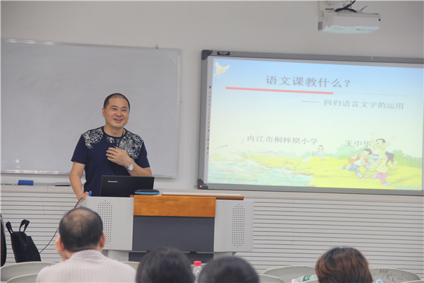 7月18日下午2点30分,内江桐梓坝小学特级教师王中华带领国培小学语文组老师一起探讨“语文课学什么”。针对这一问题王老师给出了肯定的回答——回归语言文字的运用。