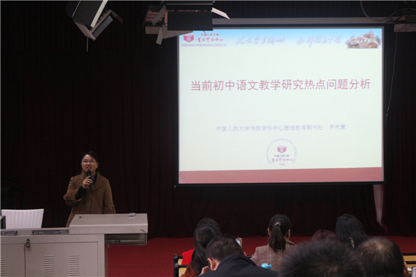 11月12日上午8点30分,中国人民大学书报资料中心语文学科主任、中国教育学会中学语文教学专业委员会理事罗先慧在中文楼501会议室作了以“当前初中语文教学研究热点问题分析”为主题的讲座。公司刘川江老师主持讲座。
