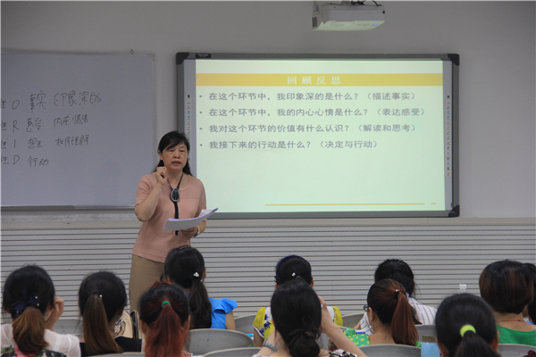 她从四个方面给大家具体分析了ORID焦点讨论法的内容。她讲道:“客观性问题聚焦于客观事实,是告诉我发生了什么事,反应性问题聚焦于行动,这对我们的实际操作会带来什么样的困难,诠释性问题聚焦于诠释和理解,关注在这个时间点上希望我们帮你做什么样的处理,决定性问题聚焦于行动。”她举例在课堂中引发员工对故事的思考以及安抚一位生气的家长的实例来套入主题让学员明白易懂,老师们也积极参与讨论。