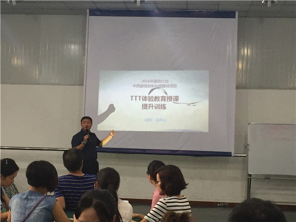 7月11日上午,国培项目初中语文组的老师在第五舞蹈房进行集中培训,培训的主题是“TTT体验教育授课提升训练”,主讲人是陕西服装大学、西安交通大学、西北大学特聘体验教育师,人社部教育培训中心国家高级体验教育师的杨凤山老师。