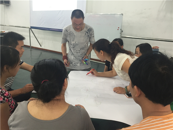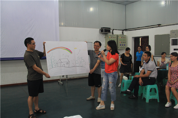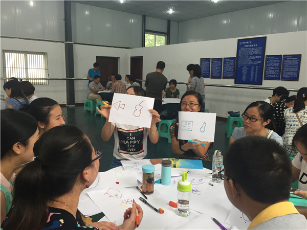 上课伊始,杜老师就让老师们在一张白纸上画出自己的名字,最后以小组为单位上台展示。来自内江威远某中学的李虹老师在讲解作品时的表现深深打动了在场的老师。她深情并茂地讲到,图片上的果树代表“李子树”,是她的姓“李”的象征,寓意着她“桃李满天下”的教育梦想;天空中的彩虹象征着希望、幸福,寓意着教育是充满希望与幸福的事业,代表她名字中的后一个字“虹”。详细生动的讲解赢得了现场的阵阵掌声,也打动了授课的杜老师。杜老师不仅夸奖这位老师的作品很棒,还肯定了这位老师具有深厚的教育情怀,是所有老师学习的榜样。