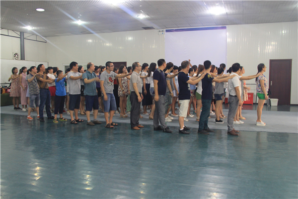 培训开始,老师便迅速带领大家进入角色,一个个个有趣游戏迅速点燃现场气氛,老师们已经忘却了上课时的疲劳迅速和培训导师互动开来。“有仇报仇,有冤报冤”拳头捶背,手拍肩膀,互捏耳垂,趣味戳腰等活动,大家玩得不亦乐乎,笑声接连不断,随后一个疯狂的报团游戏更是精彩纷呈,老师们你拉我推满头大汗,却一直欢乐的沉浸其中。