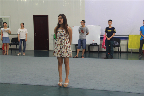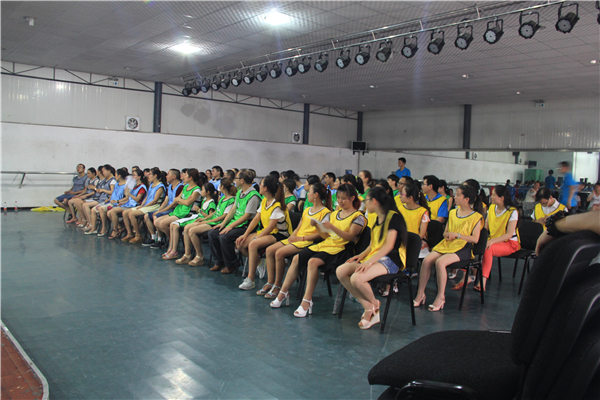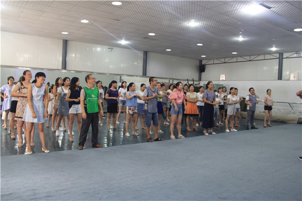 4点10分所有队伍转移四舞蹈室,两班老师组成一个庞大的队伍,他们分别穿上不同颜色的衣服,分别坐开来。接拍游戏可谓精彩连连,导师根据《众人划桨开大船》的曲调给四个队伍不同的拍子,时间虽然漫长,天气也很燥热,但老师们依旧非常配合,大家不厌其烦的重复不断练习之后用接拍形式给大家带来了一曲别样的《众人划桨开大船》,让老师们久久沉浸于激动人心的音乐中。