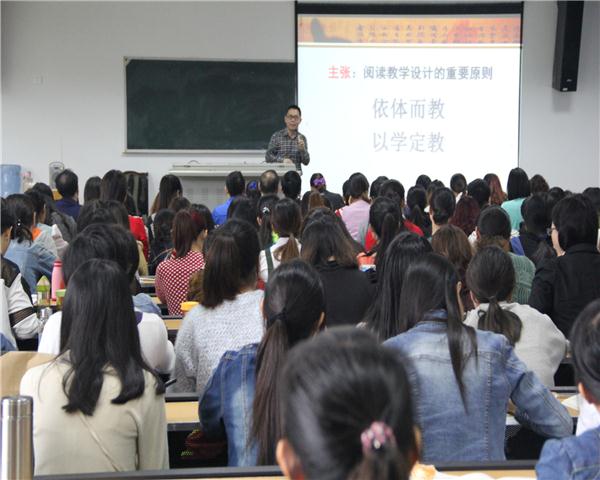 10月26日上午8点50,在中文楼304,来自重庆市渝中区教师进修公司的小学语文特级教师——王小毅老师为国培计划小学语文组及汉语言文学2014级2班的同学做了名为《小学不同文体阅读教学设计》的讲座。讲座的全程,王老师多处引用上海师大王荣生教授的研究成果。