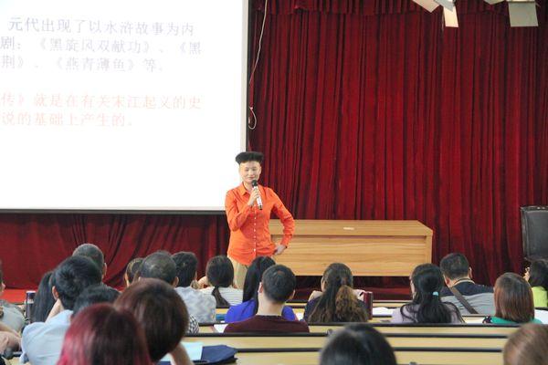 在与老师的交流中,冯利华博士认为语文教师更应细心的读名著,也强调了读原著的重要性。在简单探讨了中国四大名著之后,她重点讲解了《水浒传》。首先,她从《宋史》中的记载、文人笔记等来介绍了《水浒传》,说明了它就是一部根据民间传说编写出来的名著。她更细心的从原著中的文字来从多角度大胆地解读作者。