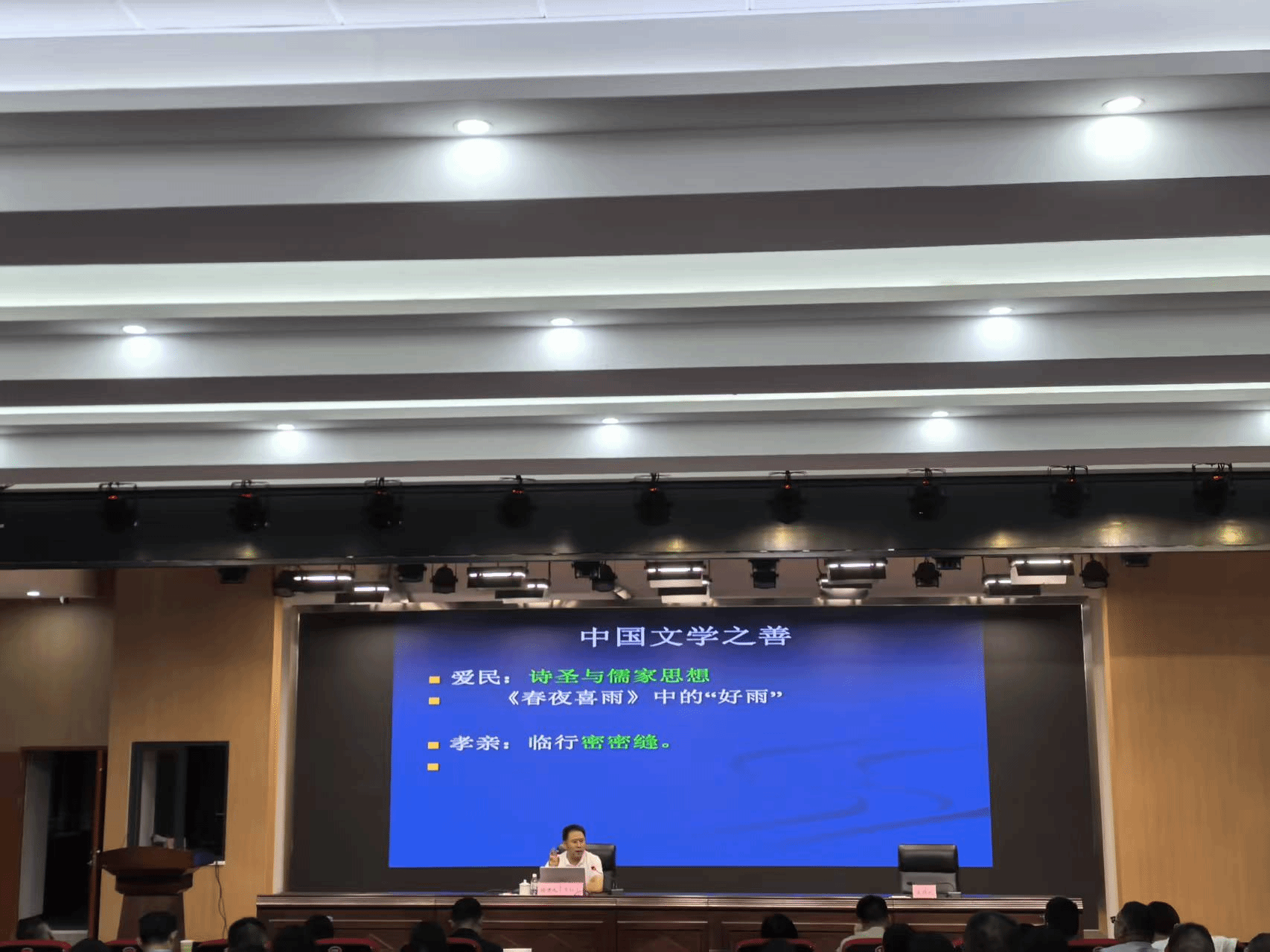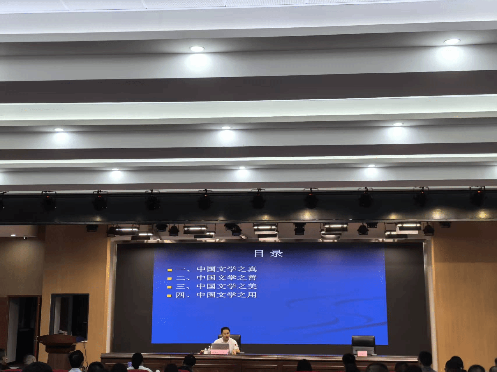 讲座伊始,梁明玉老师首先从“中国文学之真”切入,通过分析《满江红》《红楼梦》等经典作品,阐释了文学反映社会现实、揭示人性本质的“真”。他指出,中国文学中的“真”不仅体现在对历史事件的忠实记录,更体现在对人物内心世界的细腻刻画,这种真实感让文学作品具有跨越时空的生命力。在“中国文学之善”部分,梁老师以杜甫的“安得广厦千万间,大庇天下寒士俱欢颜”和范仲淹的“先天下之忧而忧,后天下之乐而乐”等名句为例,强调了中国文学中蕴含的道德关怀与社会责任感。在“中国文学之美”部分,梁老师从语言艺术、意境营造、形式创新等多个角度,分析了中国文学独特的审美特质。他以唐诗宋词的韵律之美、明清小说的叙事之妙为例,生动展示了中国文学如何通过精炼的语言和丰富的意象,创造出令人回味无穷的艺术境界。在“中国文学之用”环节,梁老师着重探讨了文学在当代社会的现实价值。他指出,文学不仅能够陶冶情操、提升人文素养,更能在社会治理、文化传承、国际交流等方面发挥独特作用。通过文学鉴赏,人们能够更好地理解中国文化的精神内核,增强文化自信。