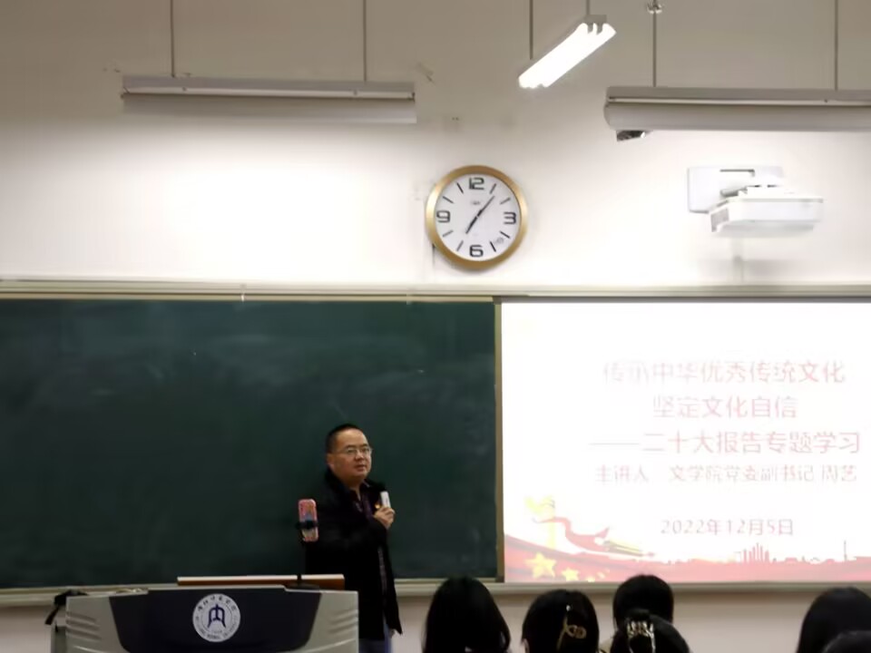 为深入学习贯彻党的二十大精神,推动公司学子坚定文化自信,12月5日晚7点,公司于明德楼B区113教室开展了以“传承中华优秀传统文化,坚定文化自信”为主题的党课。本次党课以线上、线下相结合的方式开展,由公司党委副书记(主持工作)周艺主讲,公司2019级4班及员工第一、二、三支部的全体党员、预备党员同志参与。