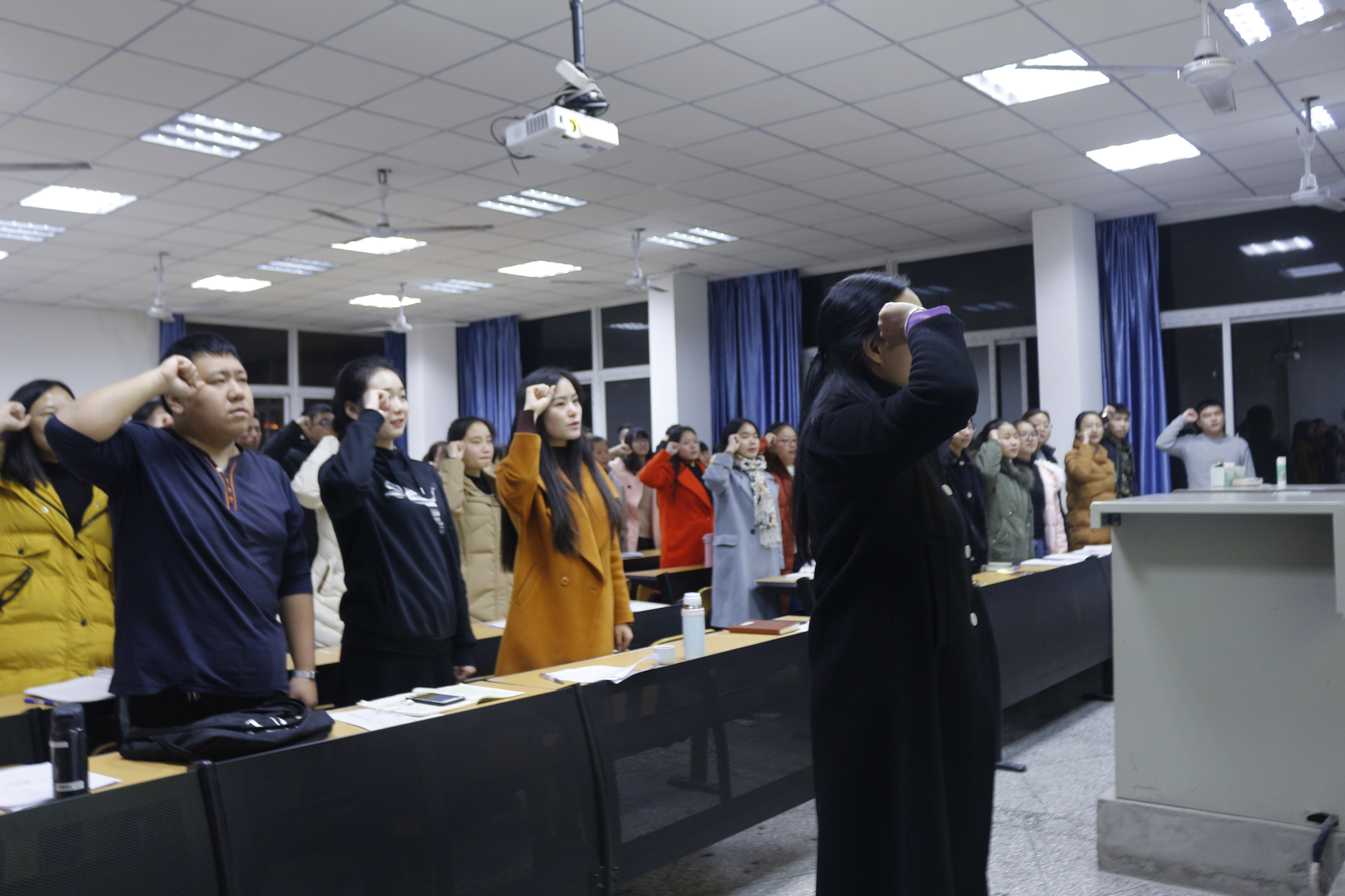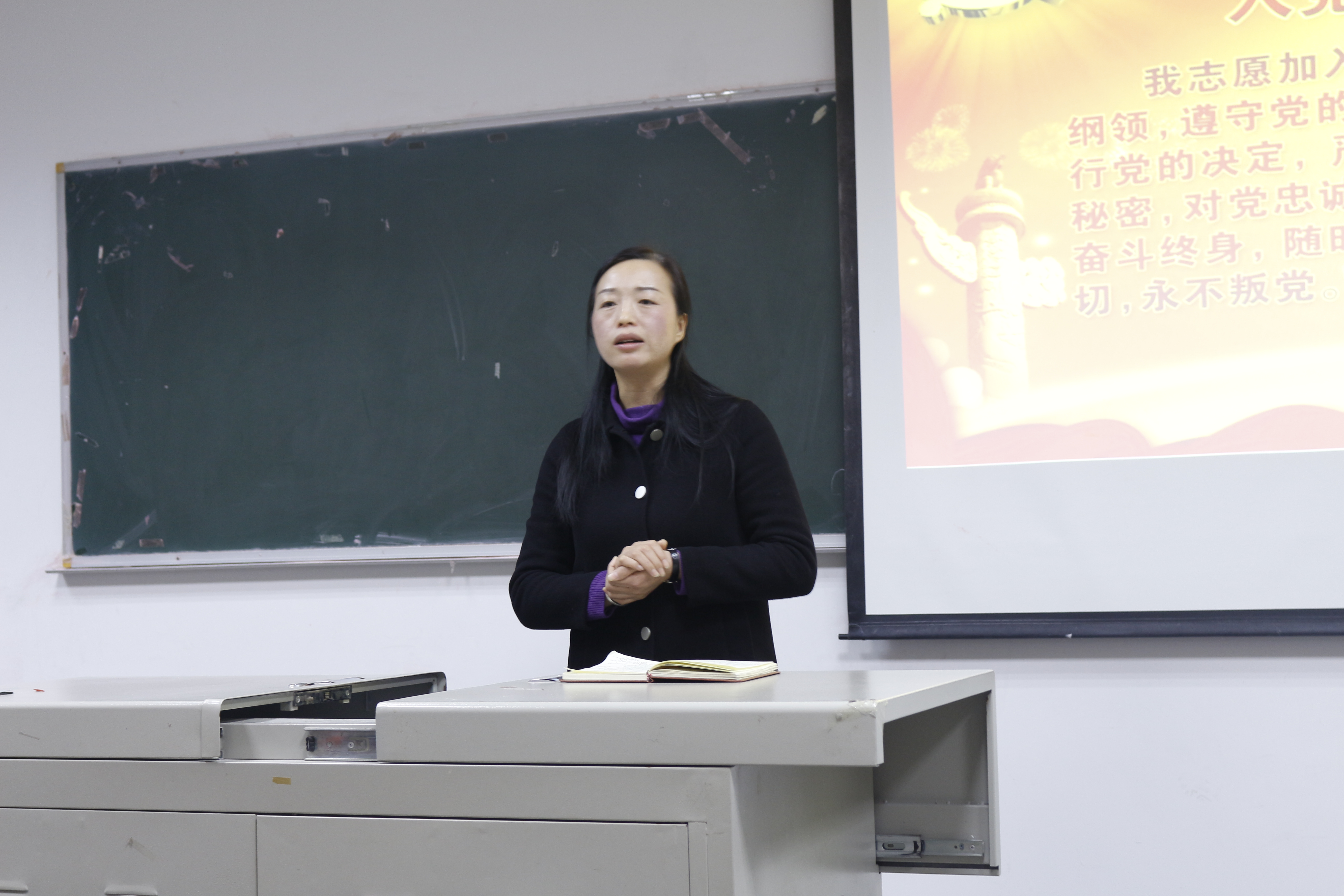 此次支部大会主要讨论了沙古雄强、王晨、黄书月等18名同志申请入党的问题。首先,18名发展对象分批次上台发言,每位同学分别提到了自己在考察期间的表现,以及对自己以后的要求。同时,他们均表示在考察期间收获满满。接着,由入党介绍人发表自己对积极分子们的看法。二支部正式党员进行不记名投票,支部大会一致同意,接收18名发展对象为中国预备党员。会议结束后,由覃华艳书记带领全体党员进行庄严宣誓。