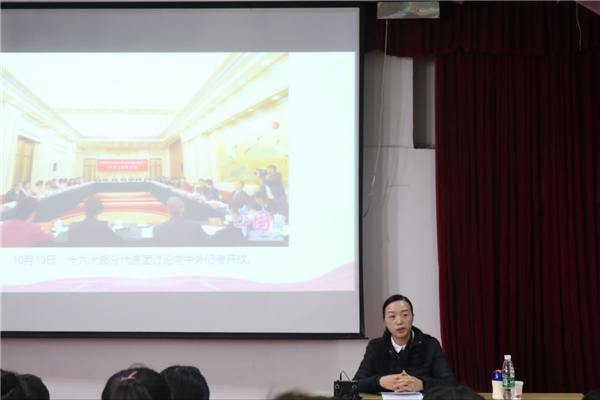 继10月23日组织全院师生党员认真学习党的十九大报告后,12月4日下午,党总支副书记覃华艳再度面向广大学子展开学习贯彻党的十九大精神宣讲,引导同学们深刻把握新时代新使命新征程新理论 ,自觉用党的十九大精神统一思想和行动。宣讲会在中文楼501教室举行,当天第四大节无课的团员员工到场聆听。