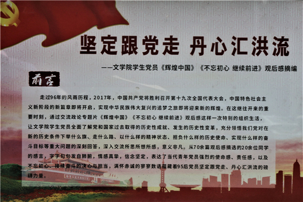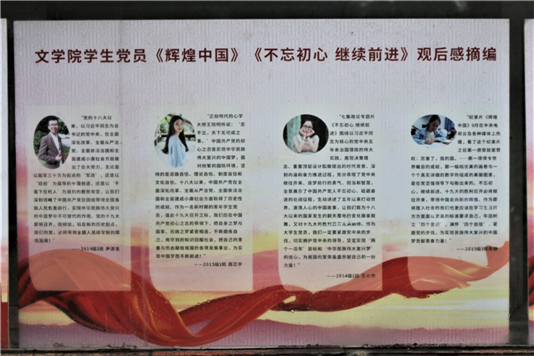 10月17日,公司员工党员《辉煌中国》《不忘初心  继续前进》观后感摘编展在中文楼前举行,这是公司员工党支部近期开展的一次组织生活的成果汇报。