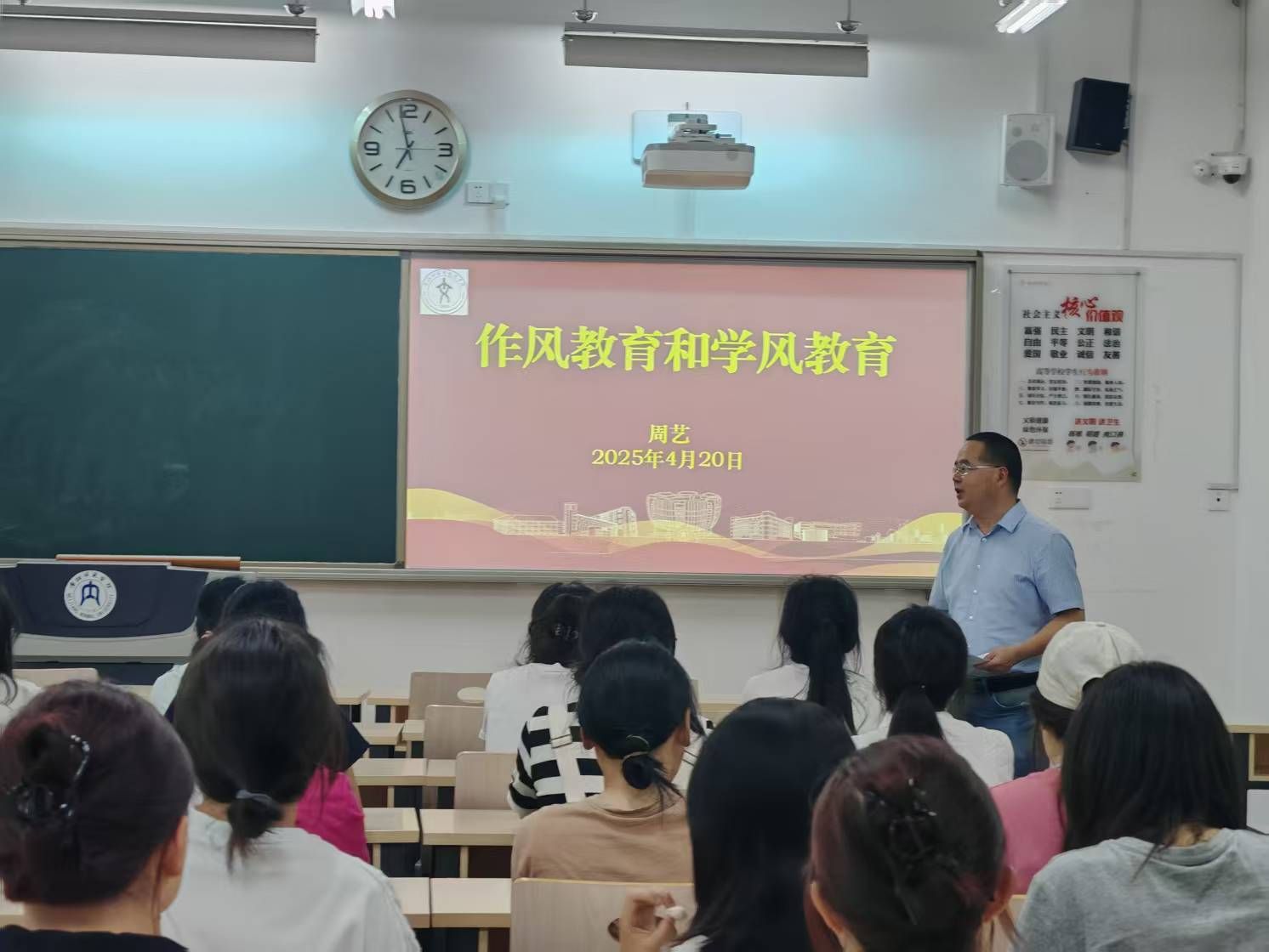 2025年4月20日,公司党委书记周艺深入联系班级2024级7班数字人文专业,为同学们带来了一场主题为《作风教育与学风教育》的党课,并参加了班级班会活动。此次党课与班会紧密结合,旨在深入贯彻中央八项规定精神,进一步加强学风建设,引导员工树立正确的学习态度和价值观。2024级7班班主任陈康哲及全体同学参加了此次会议。
