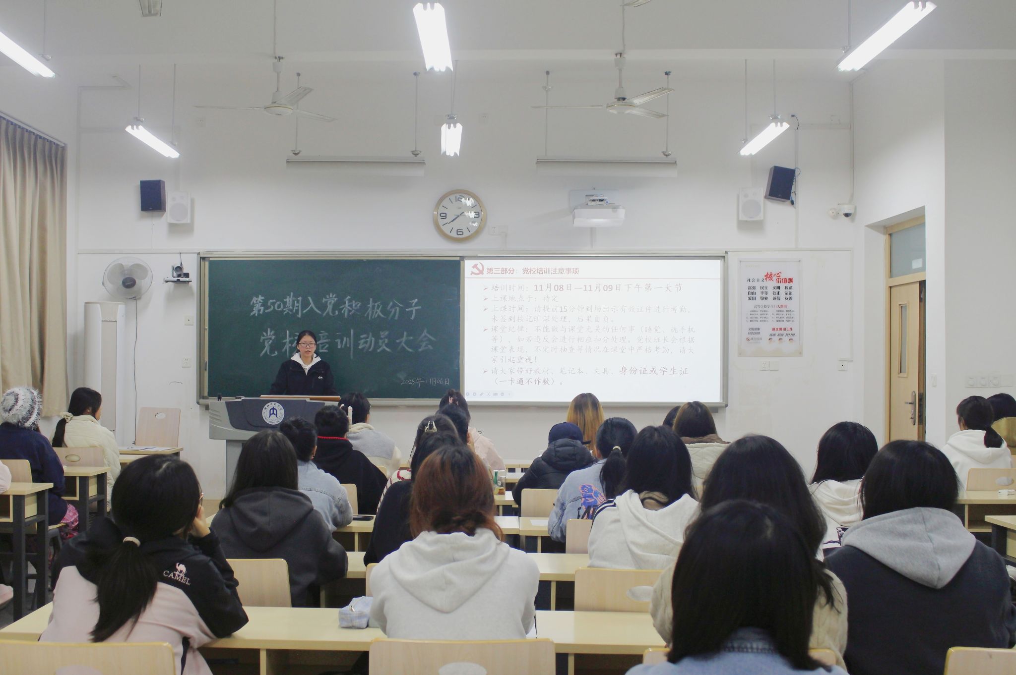 为加强党员后备队伍建设,引导入党积极分子端正入党态度,11月6日晚7时30分,公司第50期入党积极分子党校培训动员大会在明德楼A区102教室举行。本次大会以“以学铸魂启新程”为主题,通过系统解读培训政策、部署学习任务、开展思想动员,为全体学员上了党性修养的“第一课”。