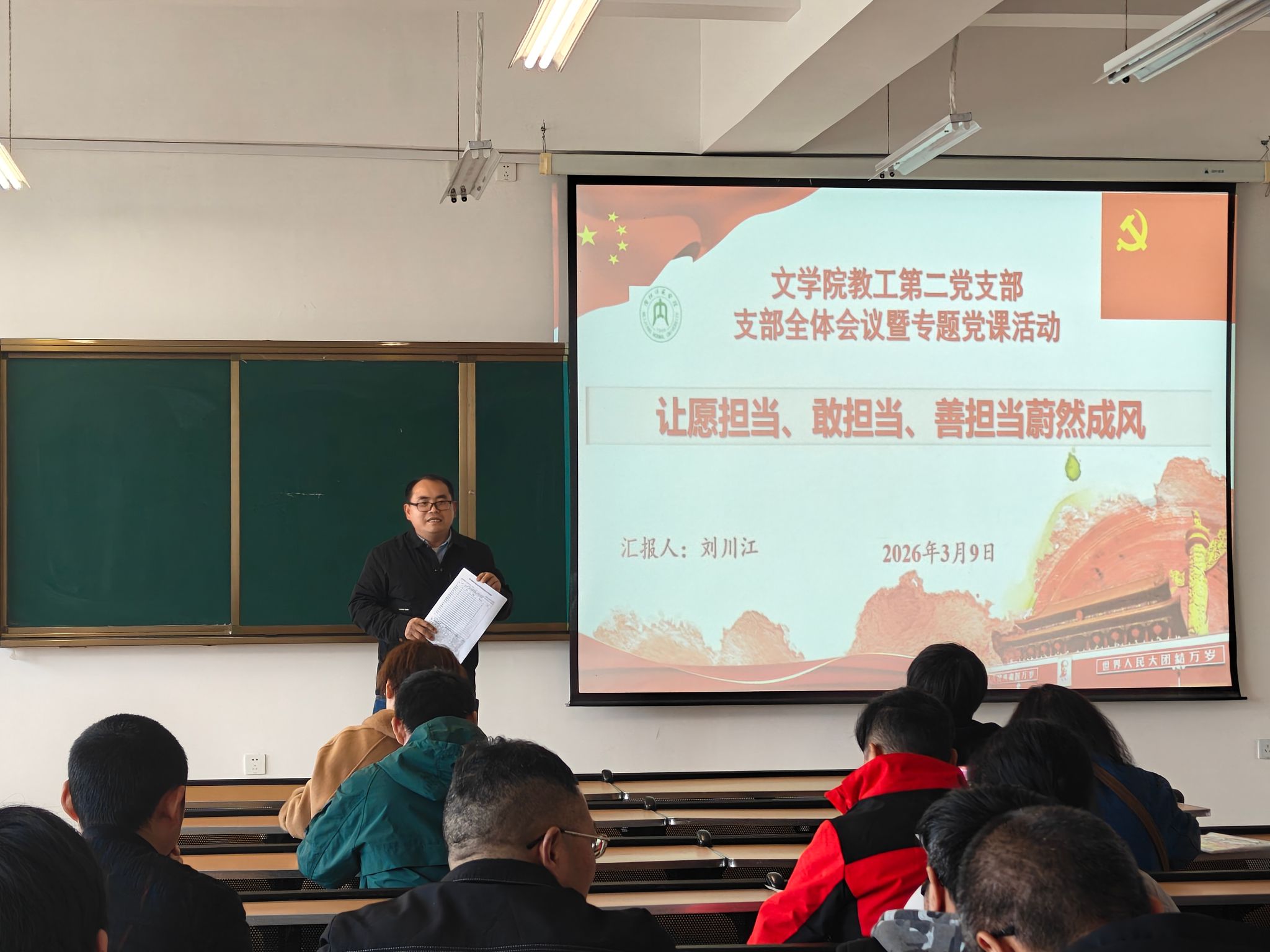 此次会议分为三个阶段。第一阶段,由刘川江同志领学了习近平总书记2026年1月20日在省部级主要领导干部学习贯彻党的二十届四中全会精神专题研讨班上重要讲话精神。第二阶段,支部全体党员共同学习了习近平总书记2012年12月至2025年12月期间关于“‘让愿担当、敢担当、善担当蔚然成风’重要论述”的关键内容节录。第三阶段,支部全体党员共同学习了中共中央办公厅近期印发的《关于在全党开展树立和践行正确政绩观学习教育的通知》内容要点和2026年度四川省教育工作会议的主要内容,并结合自身教育科研工作经历和2026年度工作计划进行了交流讨论。