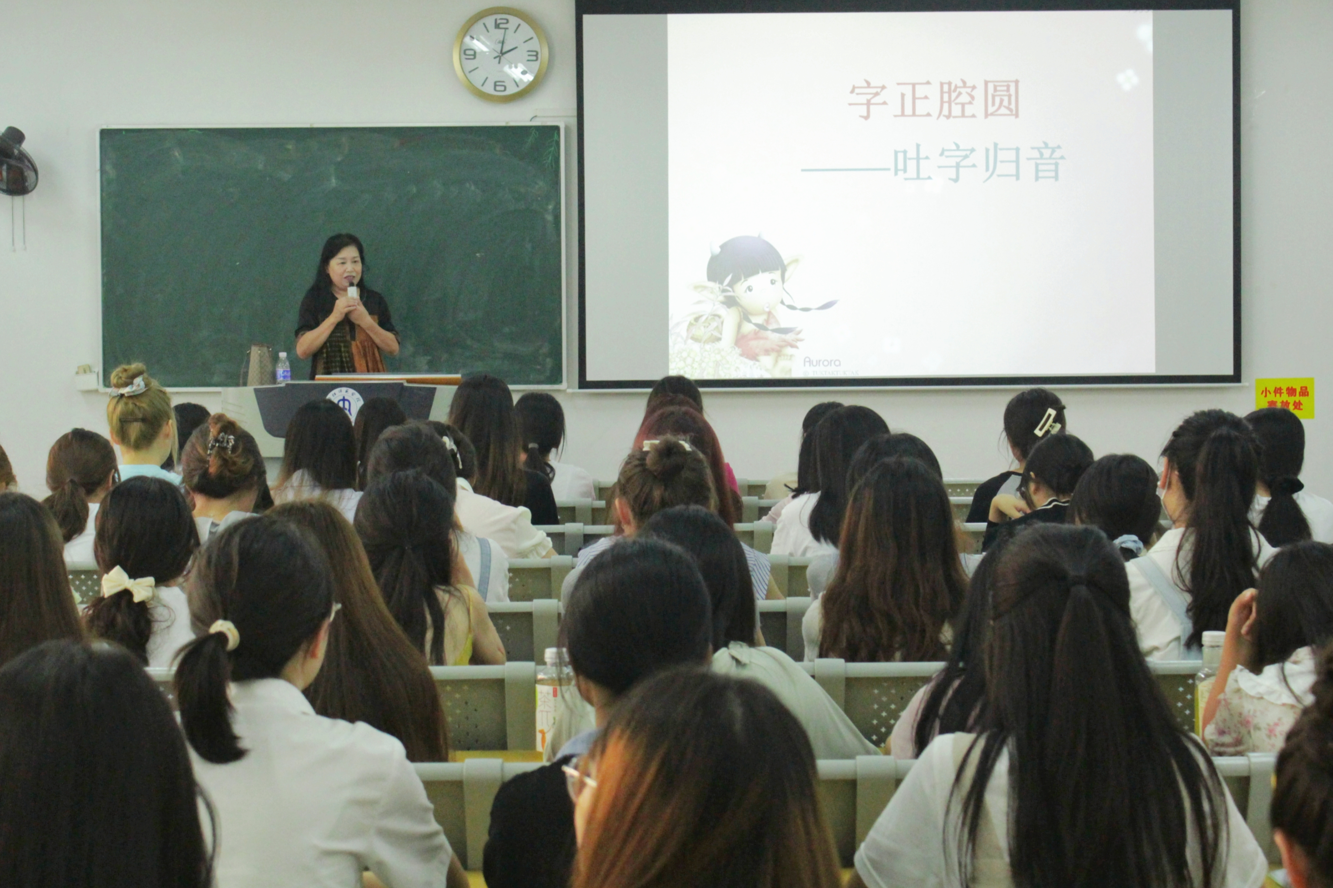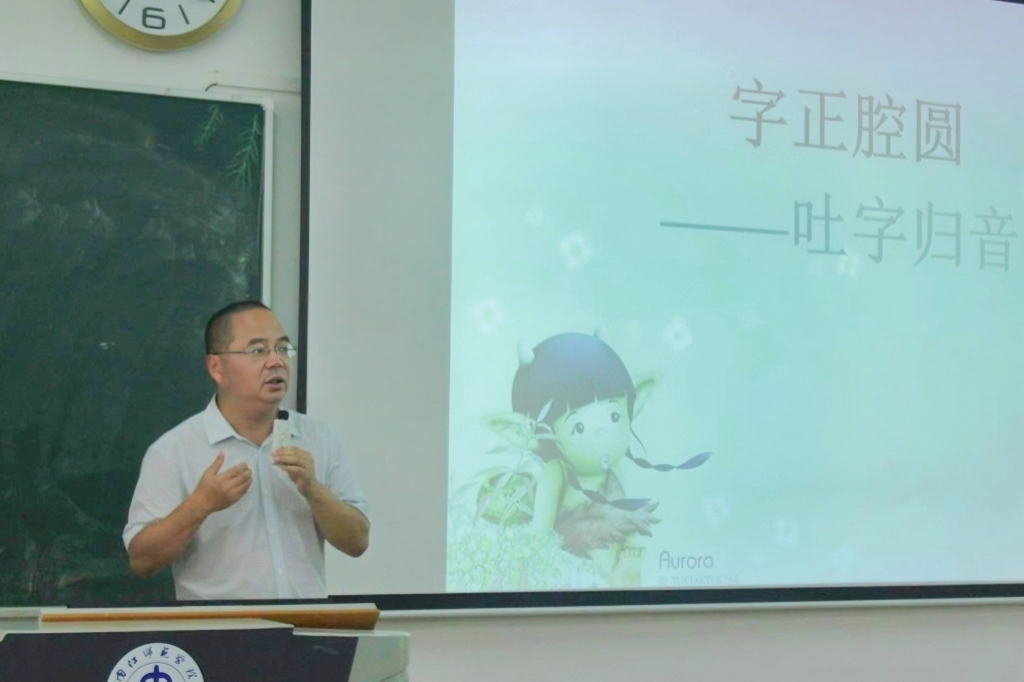 张老师首先从一些常见的语言现象入手,为在场同学们勾勒出汉字、汉语的古今发展历史、特点意义及其深厚的学理哲理,揭示其背后的优秀传统文化及深邃思想。张老师指出,学习普通话要方法得当,在掌握好基础知识、对比识记的基础上,通过不断地听、说、读、写训练,才能提高自己的普通话运用能力。随后,张老师根据声音的发音特点,为同学们讲解如何了解自己的声音,塑造有声语言,使同学们学习到呼吸控制、喉部控制等发声技巧。最后,张老师向同学们普及了各行各业从事人员所需要的普通话水平要求,例如老师、公务员、主持人和配音演员等,并具体讲解了普通话水平测试的基本流程、考核要求及等级标准,让准备报名普通话考试的同学们对其有基本的了解。