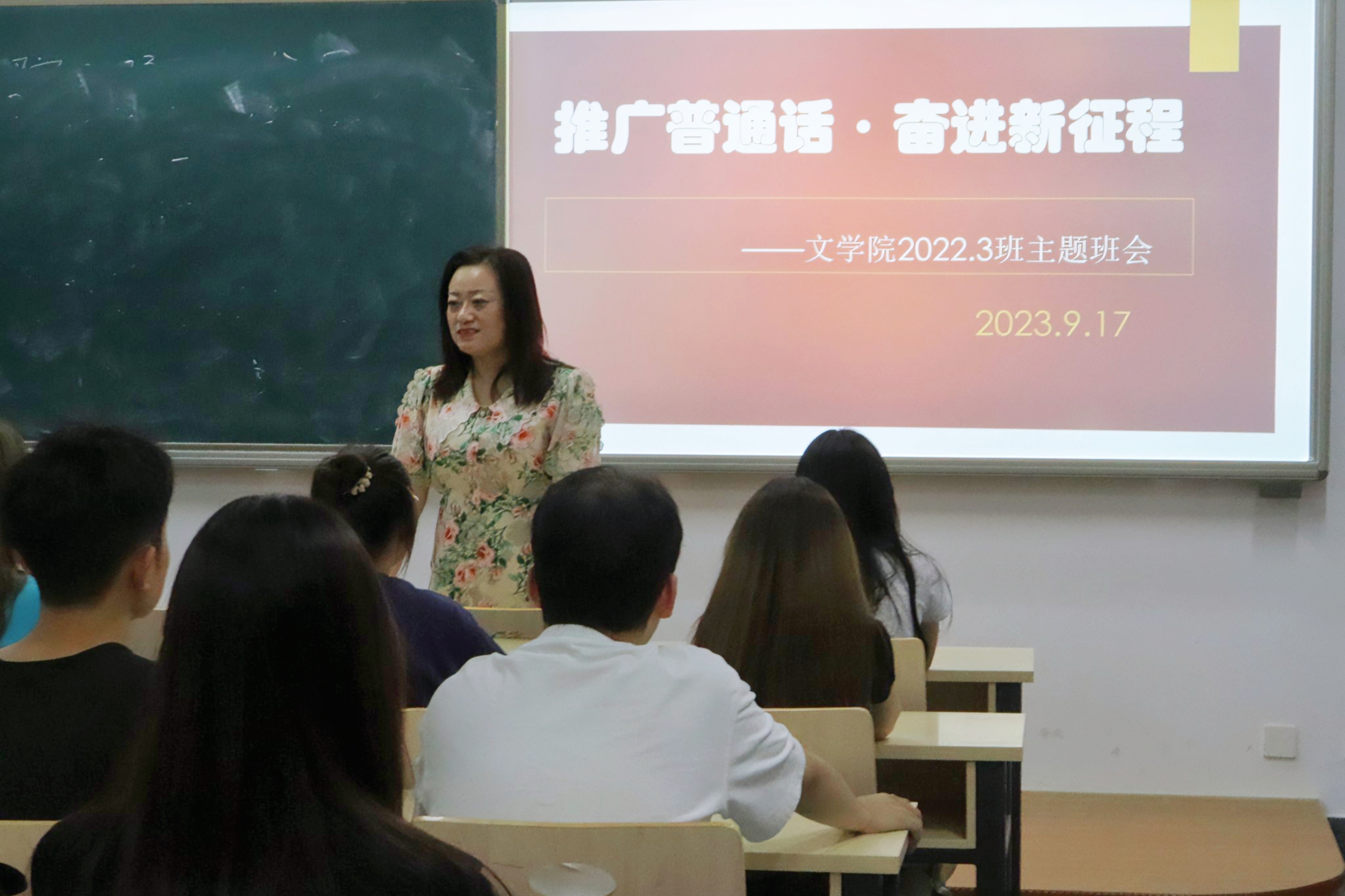 为深入贯彻党的二十大精神,传承弘扬中华优秀语言文化,在第二十六届“推普周”到来之际,公司组织各班召开“推广普通话,奋进新征程”主题班会。其中,公司2022级3班于9月17日晚上7点在明德楼B区118教室开展了本次主题班会,本次班会由公司党委副书记、纪委书记刘正丽主讲,公司2022级3班全体同学参与。