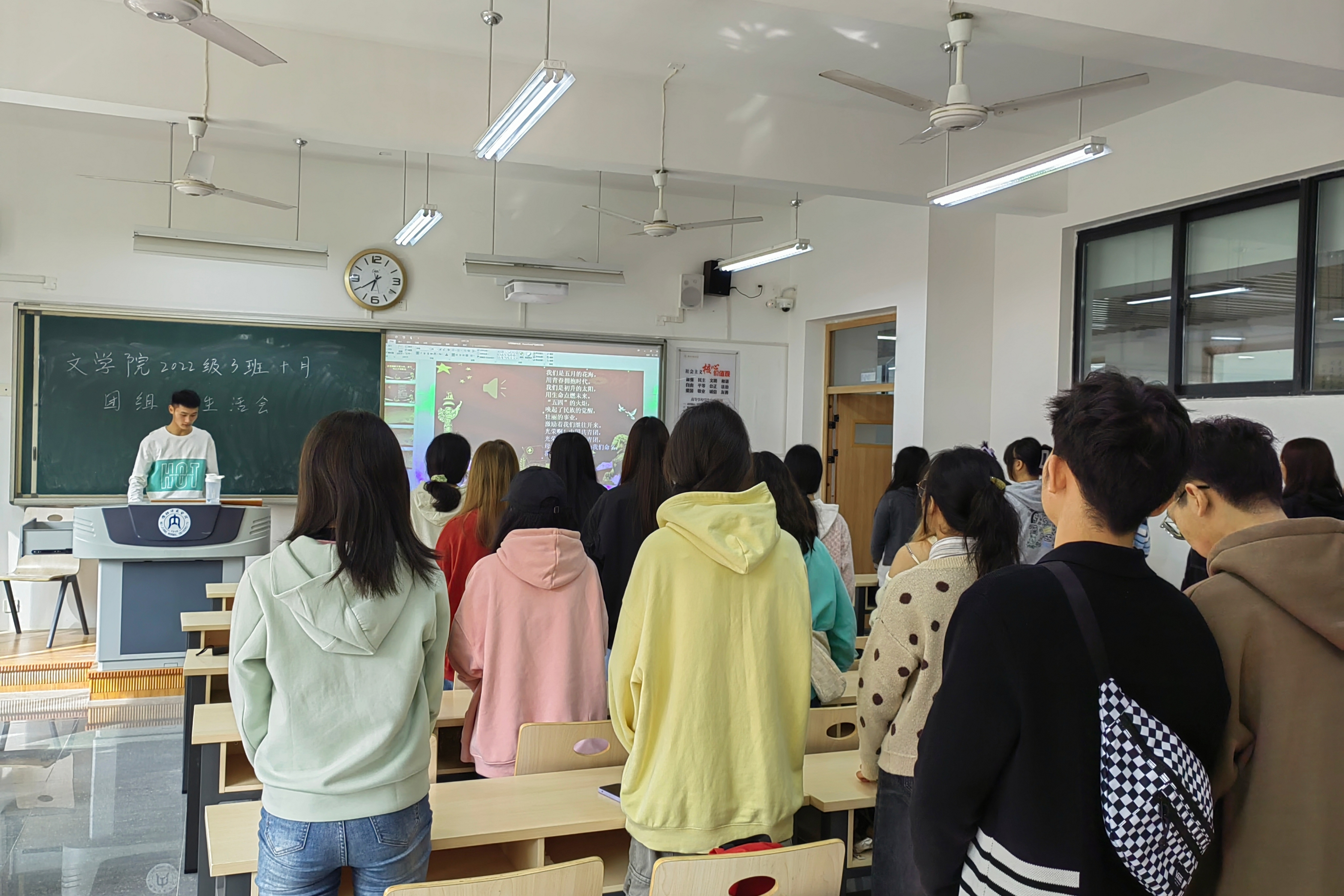 大会伊始,各班团支书针对本次团组织生活会的背景、主题及开展目的进行讲解,并带领全体同学合唱团歌《光荣啊,中国共青团》。随后,全体成员学习文章《全面学习领会习近平新时代中国特色社会主义思想》,并进行了激烈的讨论,更加深刻地体会到了自身在守正创新中传承中华优秀传统文化的责任感和使命感,坚定理想信念。紧接着,全体成员观看视频《习近平对宣传思想文化工作作出重要指示强调