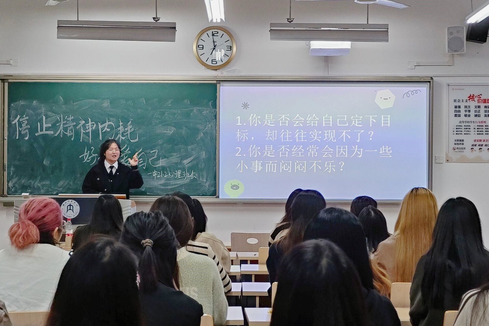 为了进一步提升公司同学的自我认识和提高专注能力、促进心理健康,拥有更加充实而愉悦的老员工活,公司于10月10日至15日陆续组织开展了心理健康主题班会。此次班会,由公司2020级、2021级辅导员和公司2022级、2023级班主任主讲,公司全体同学共同参与。其中,2021级2班、2023级4班于10月10日和15日晚在明德楼开展了该班会。