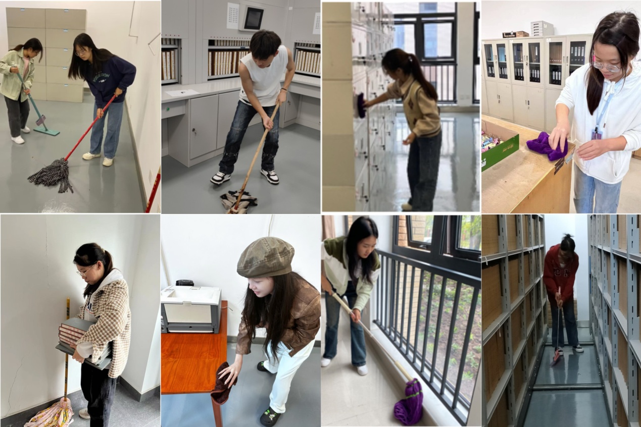 第七周是tyc5997太阳集团汉语言文学专业22级1班的劳动教育周,还未到约定时间,48名同学早已在校史馆前等待分配任务。经过与校史馆老师的沟通,22.1班员工被分为12个组,每一小组负责一间办公室,同学们分工明确:擦桌子、整理陈列架、扫地、拖地,大家相互配合,干得不亦乐乎。很快,校史馆档案室就以整洁的面貌呈现在大家眼前了。