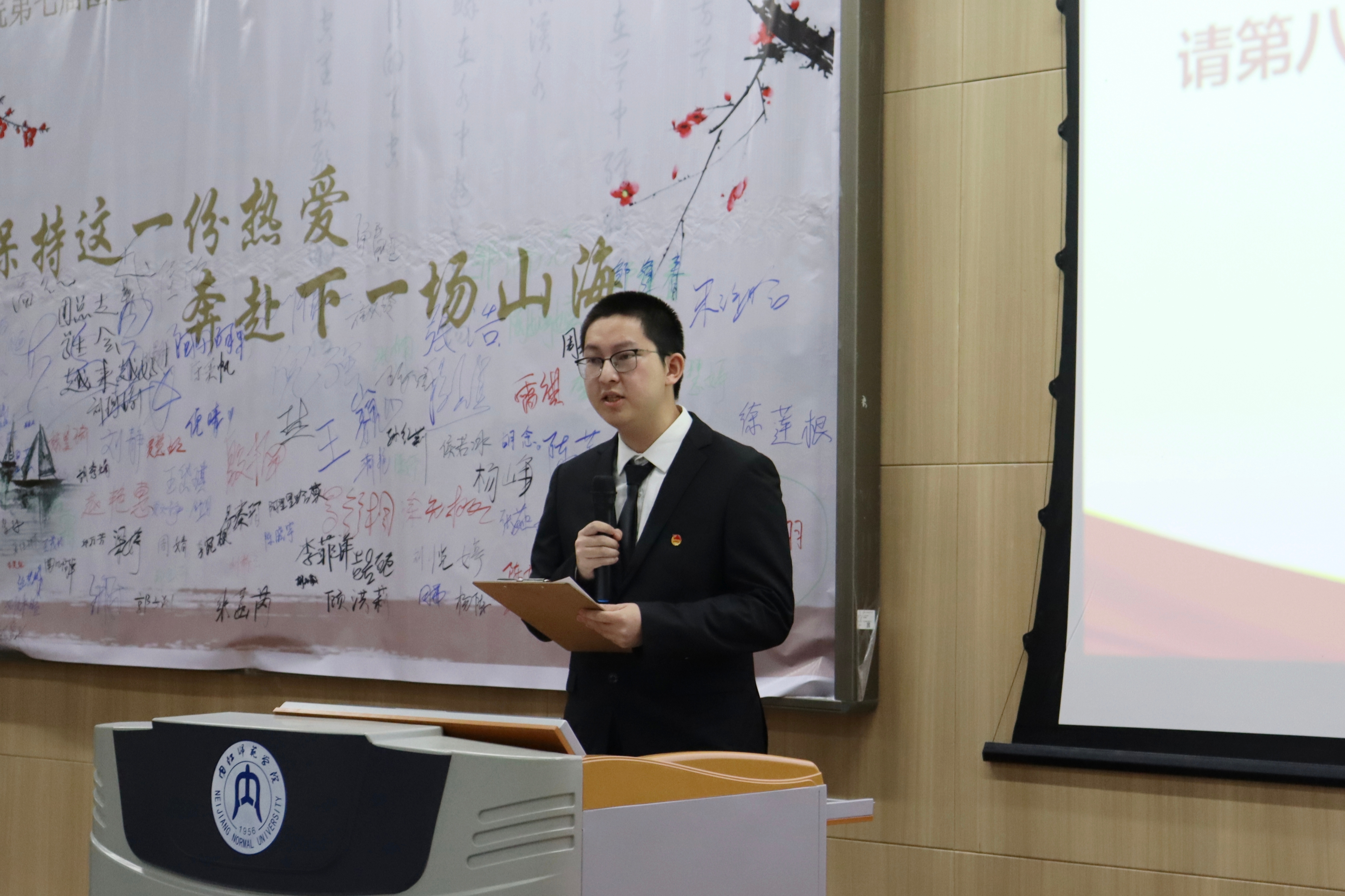 6月14日晚上7点,公司于明德楼B区004教室举行第七届团总支员工会换届仪式。出席本次仪式的有公司党委副书记、纪委书记刘正丽,学工办副主任金夏老师,学工办辅导员汤靓老师、甘成望老师,第七届团总支副书记(员工)刘于湘,第七届团总支员工会执行主席高锐,主席团成员戴佳欣、张浩,第七届团总支员工会各部门负责人及志愿者。第八届团总支员工会执行主席熊洲澜担任本此大会主持人。