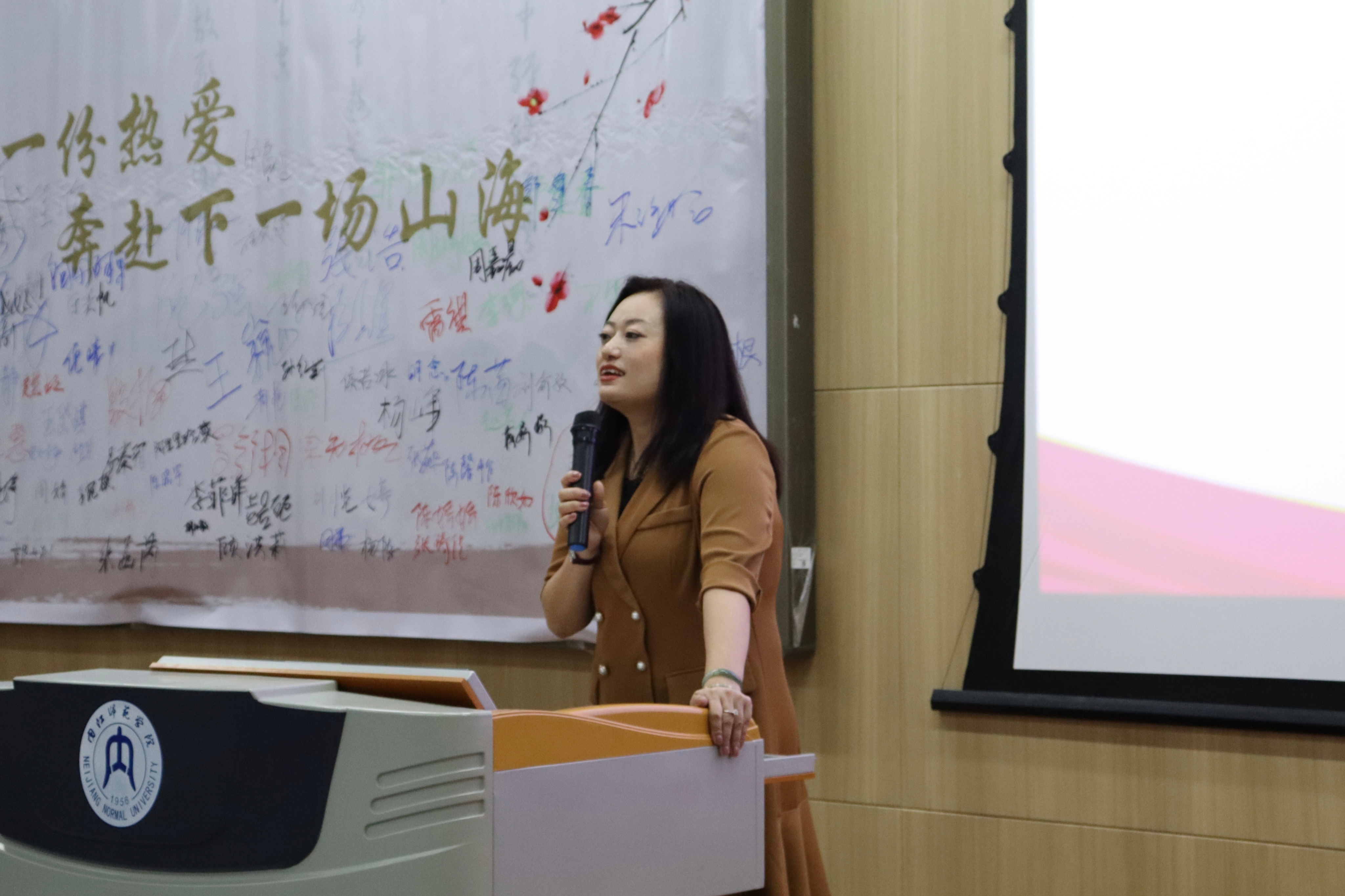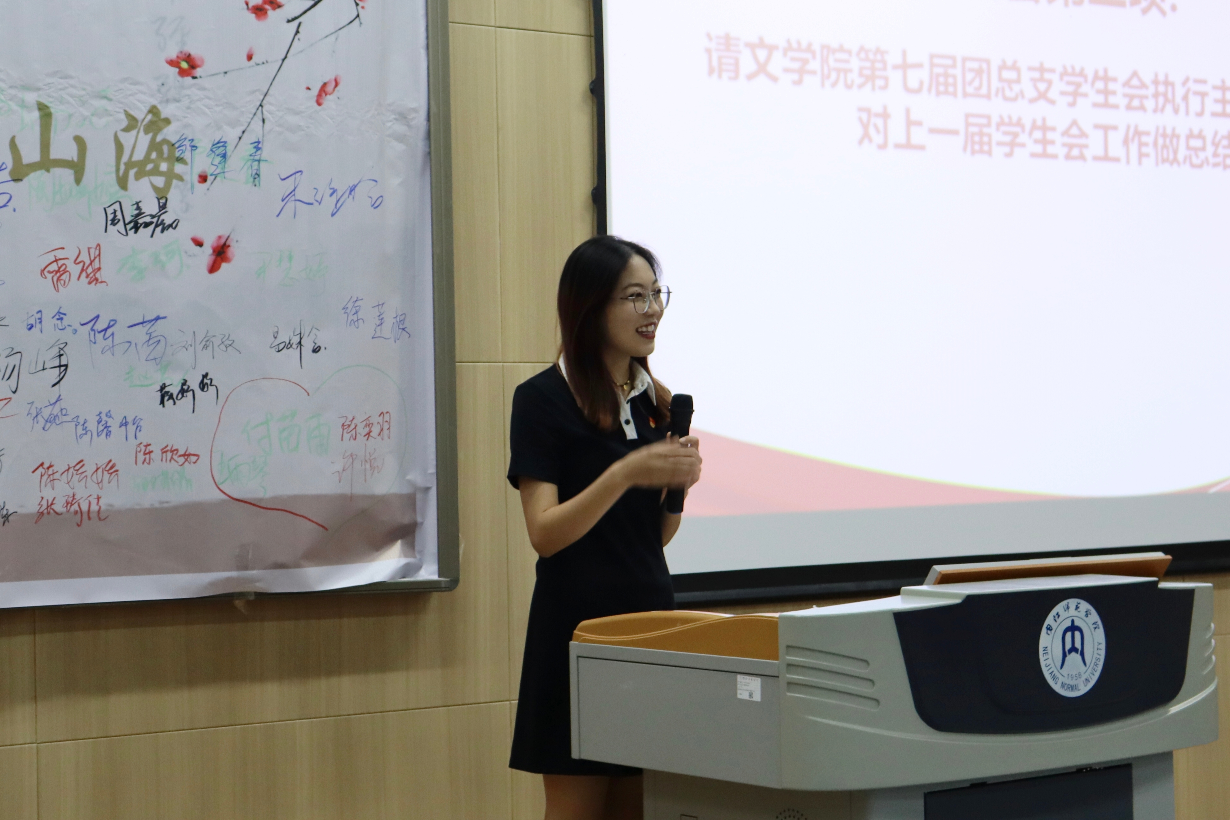 大会伊始,第七届团总支员工会执行主席高锐进行工作总结,她肯定了员工会全体成员在过去一年的工作中的突出表现,对大家的辛苦付出表示感谢,并对新一届员工会的发展提出美好期望,“员工会的接力棒已传到新一届成员手中,你们荣誉与责任并重,希望在你们的带领下能够建设‘仰望星空,以服务同学为导向;脚踏实地,具有团队协作精神’的员工会集体”。随后,第七届团总支副书记(员工)刘于湘宣读新一届员工会干部名单,在表示祝贺的同时也对他们寄予了厚望,负责人们也通过提前准备好的视频、画扇、书签表达了对部门小伙伴们的美好祝福和殷切期望,接着,老师们为主席团成员及各部门负责人颁发聘书并合影留念。紧接着,第八届团总支副书记(员工)王睿发表就职演说,总结了过去工作中的收获和不足,并提出今后的改进措施和工作计划,希望新一届员工会干部能“在其位,谋其职,负其责,尽其事”,通过携手合作,把员工会越办越好。最后,刘正丽书记进行总结讲话,她表示,员工会是一个汇聚青春正能量的集体,在接下来的日子里,希望全体同学能够真心实意的支持员工会的工作,相信经过大家的共同努力,员工活动将更有特色、更有成效,员工会工作一定会再上新台阶!