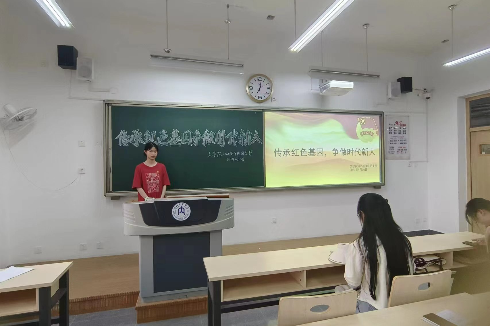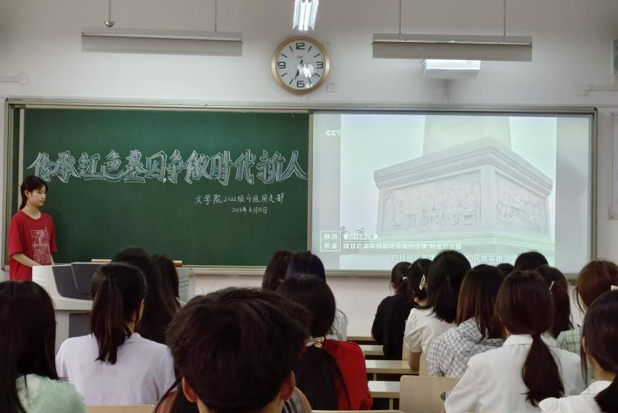 团会伊始,各班同学合唱团歌《光荣啊,中国共青团》。接下来,大家一起学习了文章《重温难忘瞬间,感悟总书记的英雄情怀》,并观看了红色文化宣传片《一声一世》和微视频《英雄之光|以国之名 慎终追远》。从文章和视频中,同学们深刻地感悟到,一个有希望的民族不能没有英雄,一个有前途的国家不能没有先锋。随后,各班团支书带领全体同学观看了2023年清明节特别策划《此致,敬礼!》,为黄文秀、王伟等无数英雄的奉献精神所感动,更被他们不屈的信念所折服。团会最后,同学们积极分享了自身的心得体会,其中,2022级4班的组织委员贾文静表示,作为新一代青年,我们要厚植爱国主义情怀,把爱国情、强国志、报国行自觉融入到日常的学习生活中去,努力成为有理想、有本领、有担当的时代新人。