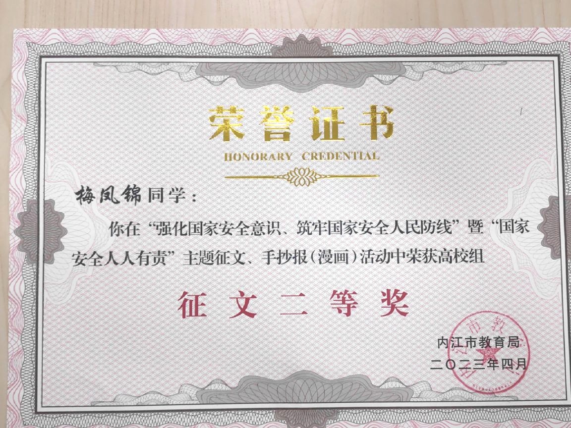为进一步推动同学们学习和把握总体国家安全观的基本要义、精神实质和基本要求,引导同学们树立国家安全意识,培养优良学风,内江市国家安全局、内江市教育局组织开展了以“强化国家安全意识、筑牢国家安全人民防线”暨“国家安全、人人有责”为主题的征文比赛活动。其中,公司2021级5班的王睿同学、2022级3班的梅凤锦同学分别取得了征文比赛一等奖、手抄报比赛二等奖的优异成绩。