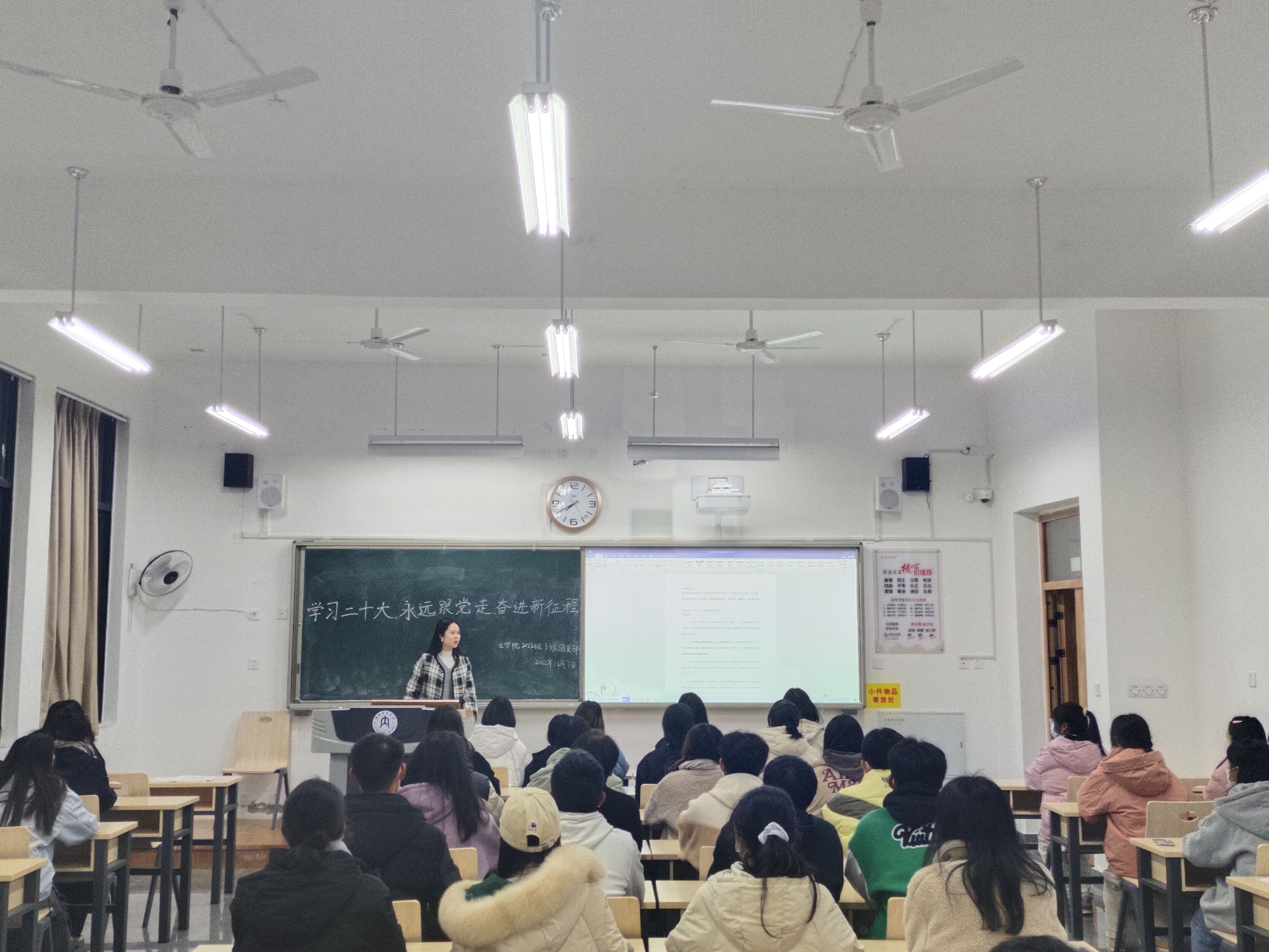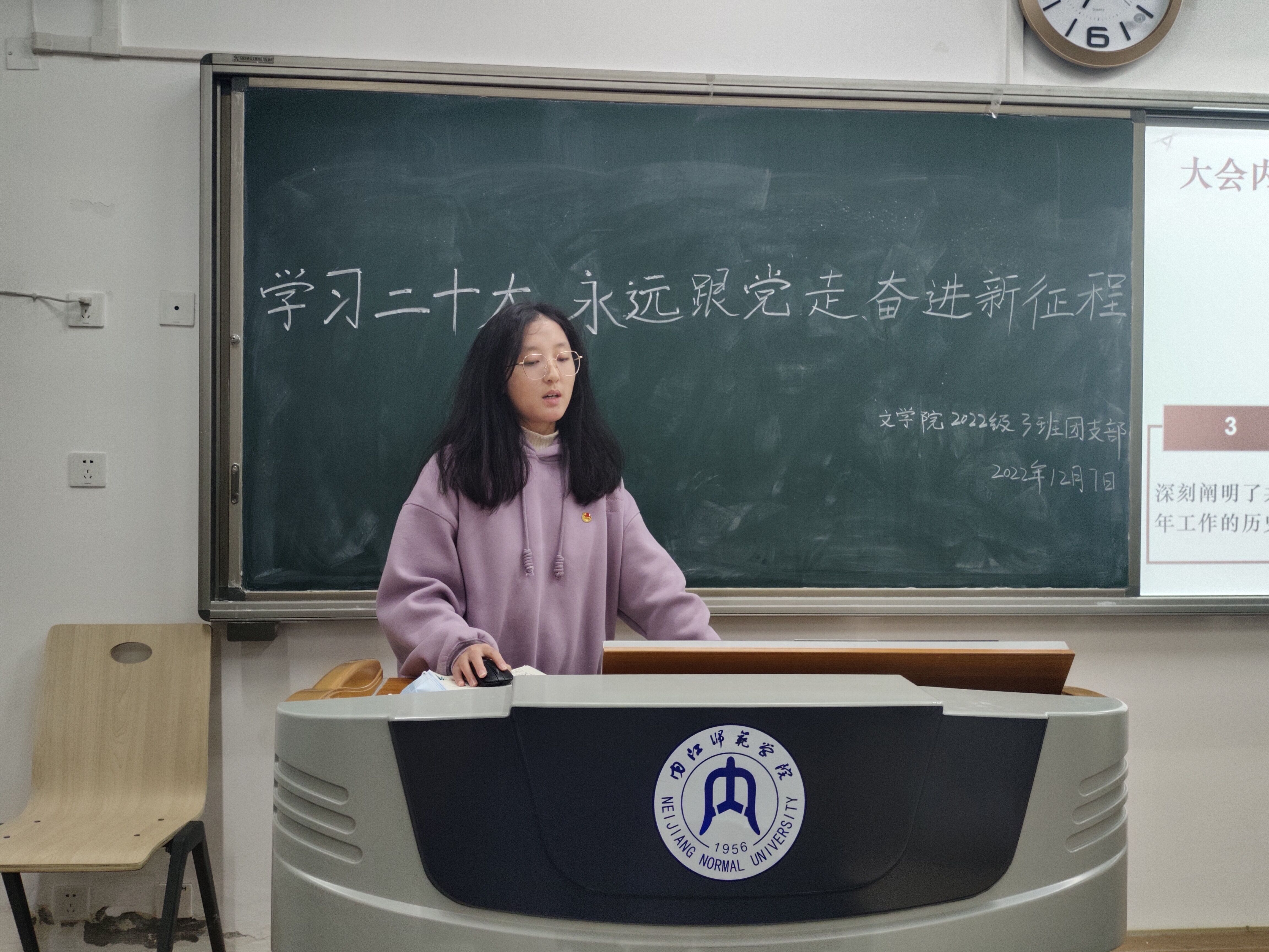 会议伊始,各班团支书简要介绍了此次团组织生活会的主要内容,并带领同学们满怀激情地唱响了团歌《光荣啊,中国共青团》。随后,各班团支书向全体同学汇报了团支部今年开展的“学习二十大、永远跟党走、奋进新征程”主题教育实践活动情况。接下来,同学们相互交流了这一年间团组织生活会中的收获与不足,并认真规划了自身未来发展方向。在谈到老员工团员应树立的职业观时,2022级3班的刘鑫鑫同学表示,作为团员青年的我们应坚持党的领导,努力提升自己,端正就业态度,将社会需要与个人需要相结合,积极投身建设国家事业,树立远大就业目标。会议最后,各班团支书主持开展了团员先进性民主测评,并带领同学们重温了入团誓词。其中,学工办副主任金夏老师在2022级3班的团组织生活会上指出,党旗所指就是团旗所向,希望各位团员青年保持干劲、奋发图强,以昂扬姿态投身于社会主义建设。