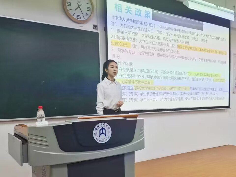 为进一步宣传国家征兵政策,鼓励广大学子响应国家号召,积极投身到保卫祖国的神圣事业中,3月10日晚上7点,公司于明德楼B区202教室、203教室组织开展“征兵政策宣讲”活动。公司学工办副主任金夏老师,第七届团总支员工会主席团成员张浩以及公司各年级部分同学参与此次活动,本次会议由2019级2班苏文洁、2020级3班陈茂林两位同学担任主讲人。