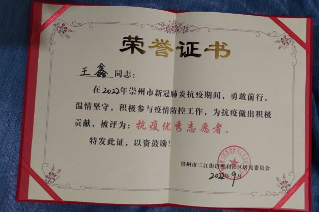 “8.25”成都疫情袭来,在此危机关头,王鑫同学积极响应政府号召,主动报名参加社区抗疫志愿队,为抗击疫情贡献自己的青春力量,帮助家乡渡过难关。王鑫同学在此次抗疫志愿服务工作中,主要负责协助医护人员进行全员核酸采集工作。由于全员核酸人流压力过大,他每天早出晚归。从早上六点一直工作到凌晨,坚决做到进出必查、体温必测、信息必登、外出必劝。