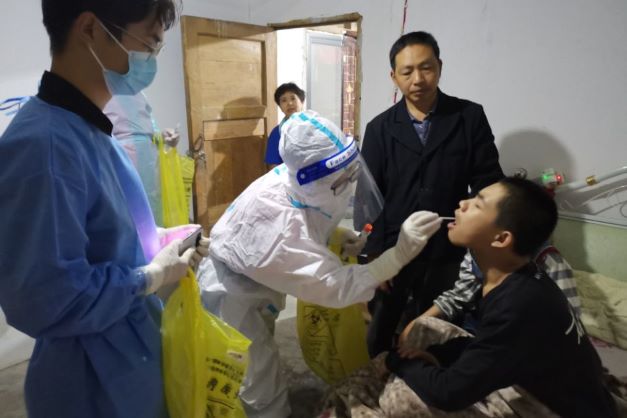 除定点核酸检测的工作外,王鑫同学每天也会一同随医护人员进行下乡采集核酸样本的工作。路途遥远、道路泥泞、人群分散这无疑是会为核酸采集工作加大难度。他每天戴着口罩,拿着工作证和采集本,在村干部的带领下挨家挨户地拜访,为那些出行不便的老年人和残疾人进行上门核酸检测。与此同时,他积极向村民们宣传防疫基础知识,提醒村民出门时要规范佩戴口罩,时刻注意疫情防护。最后,当谈及他做志愿时的感受时,他说,每天身穿防护服在楼道和乡间穿行,很多时候都感觉自己快要因劳累而放弃了,但每次听到那一句句感谢的话语时,觉得此刻的一切辛苦都值得了。