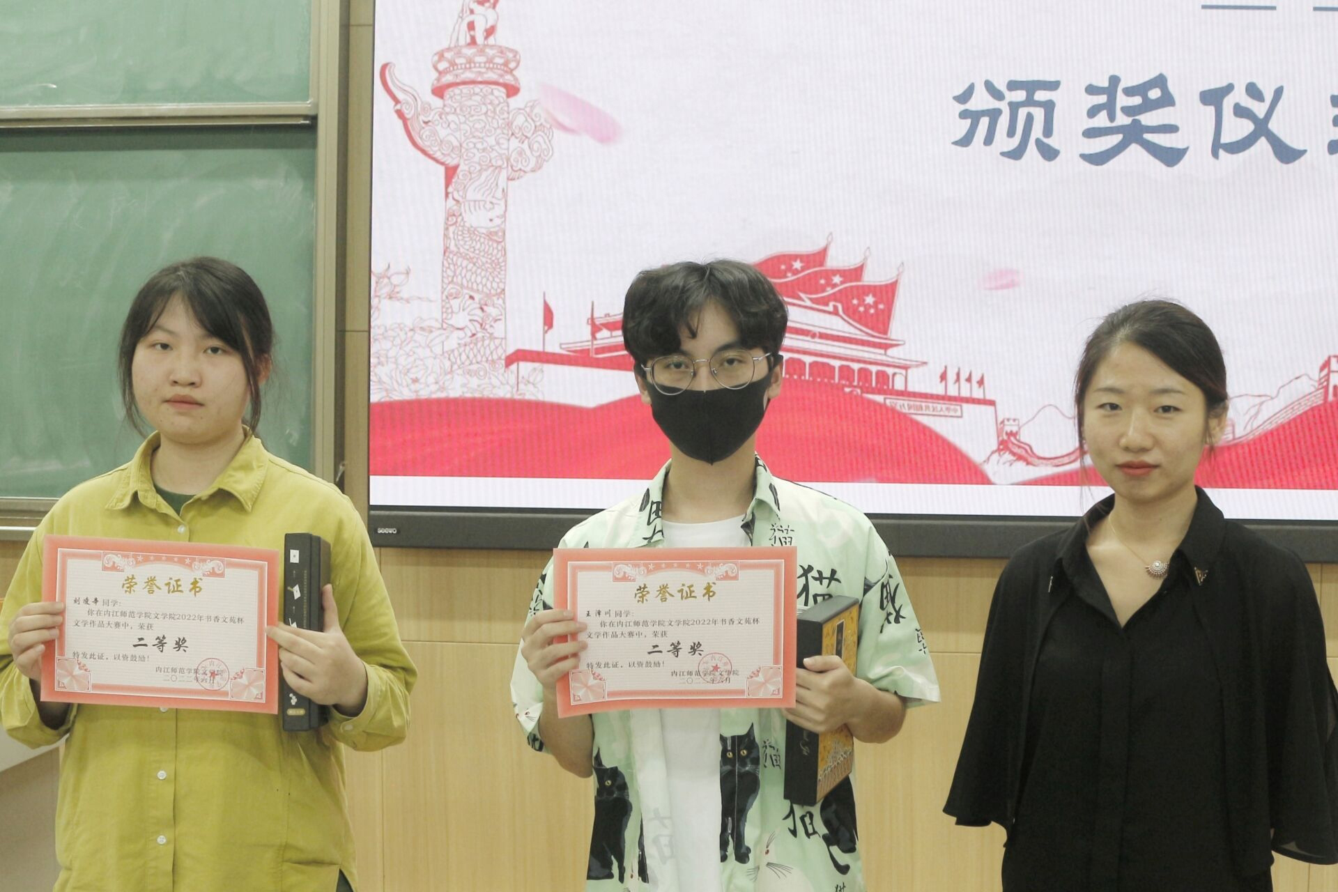 颁奖仪式开始,由刘书记发表讲话。其中,她提到举办“书香文苑杯”征文比赛目的是为了锻炼大家,提升大家的写作素养,同时,公司将在今后继续开展系列征文活动,鼓励文苑新青年们用努力与奋斗铸就青春底色,用创新与发展谱写青春华章,希望大家坚持写作,提高自己的写作能力,丰富自己的文化底蕴。随后,公司党总支副书记刘正丽、学工办辅导员汤靓老师、第七届团总支员工会执行主席高锐和沱江潮文学社社长李墨轩为获奖同学颁发荣誉证书和奖品并合影留念。最后,汤老师对此次颁奖仪式进行总结,希望大家能通过此次比赛提高写作兴趣,锻炼写作能力,在今后的生活中爱好读书,勤于思考,勤学知识,不辜负大学的美好时光。