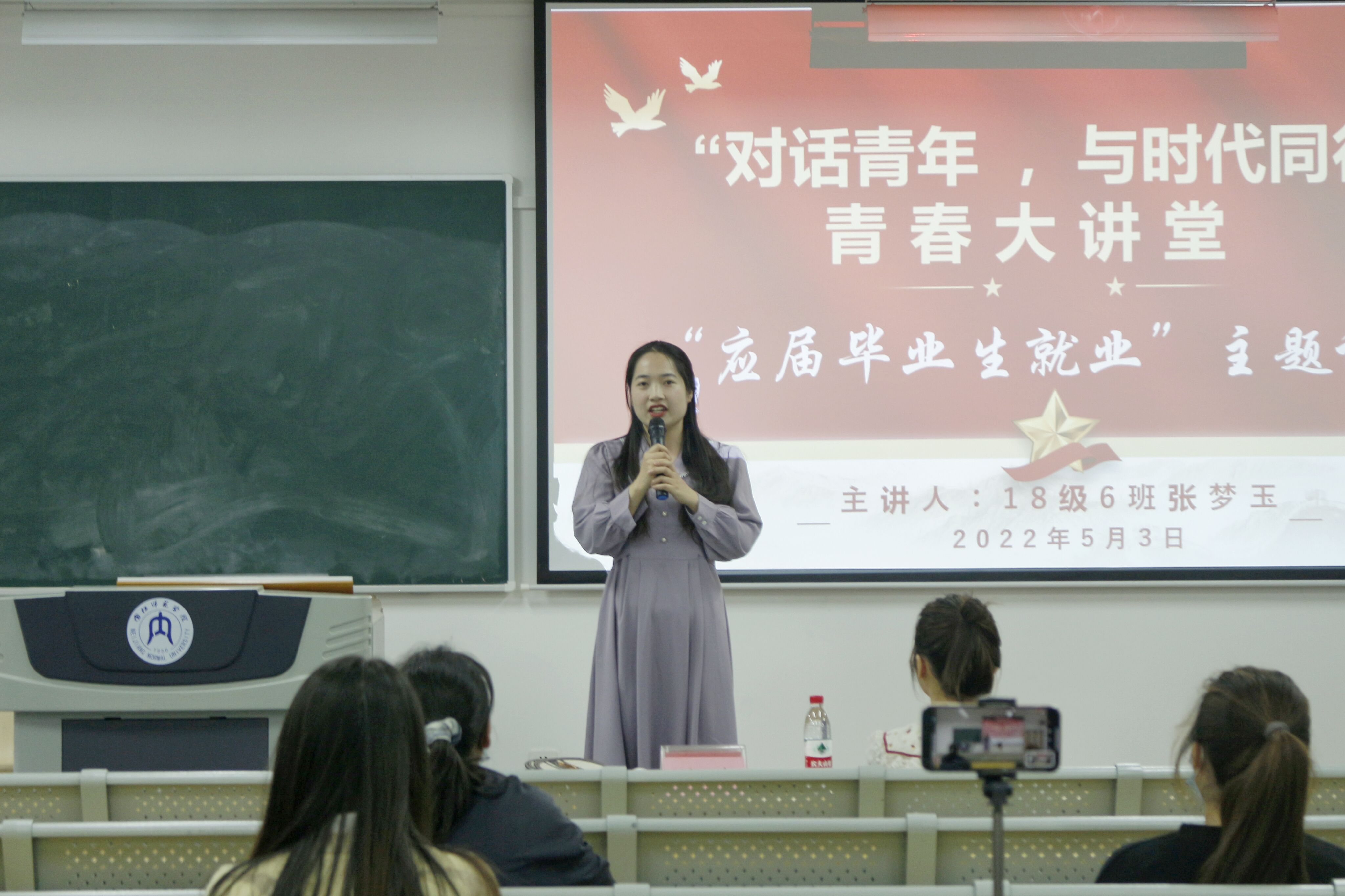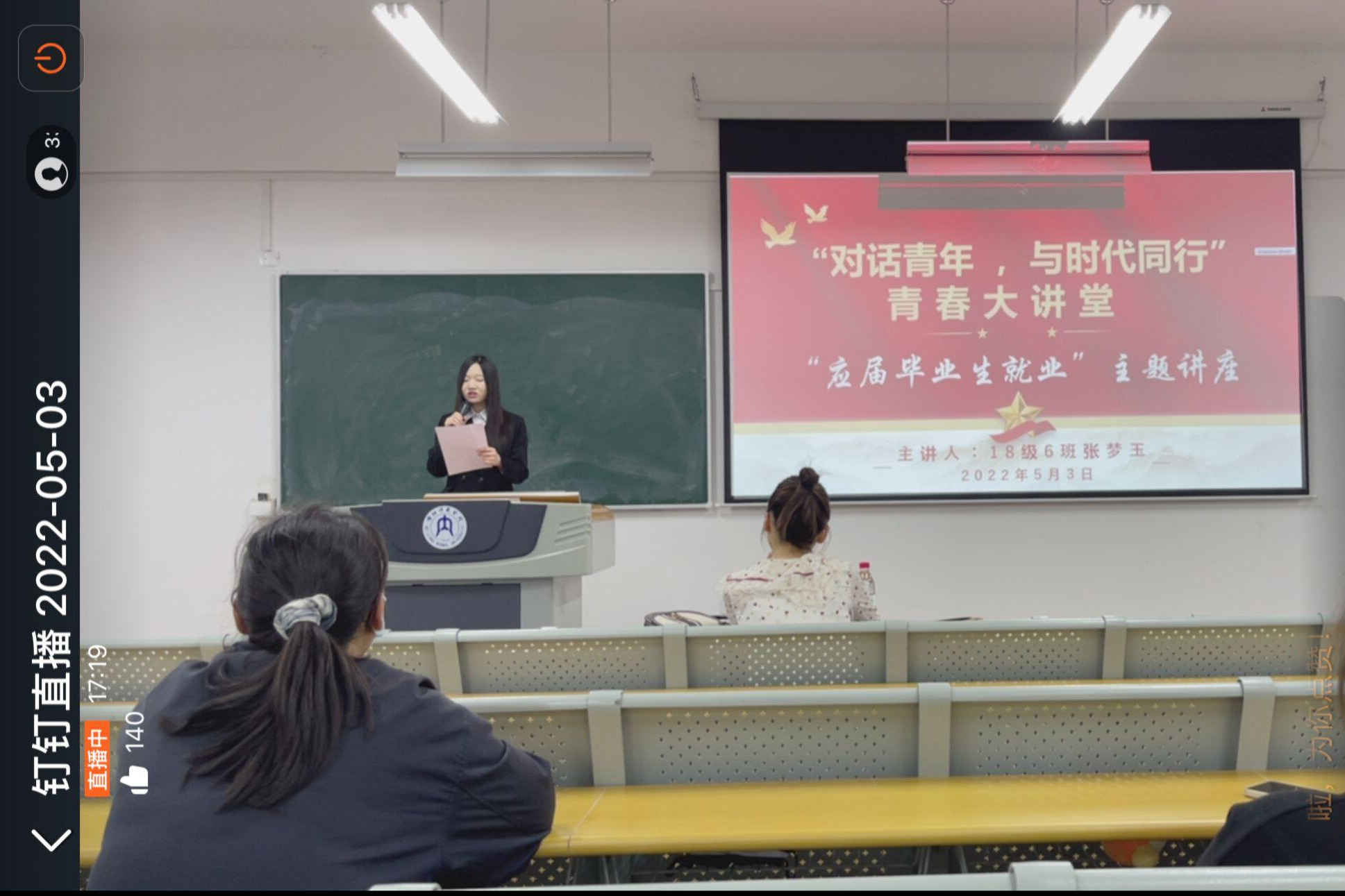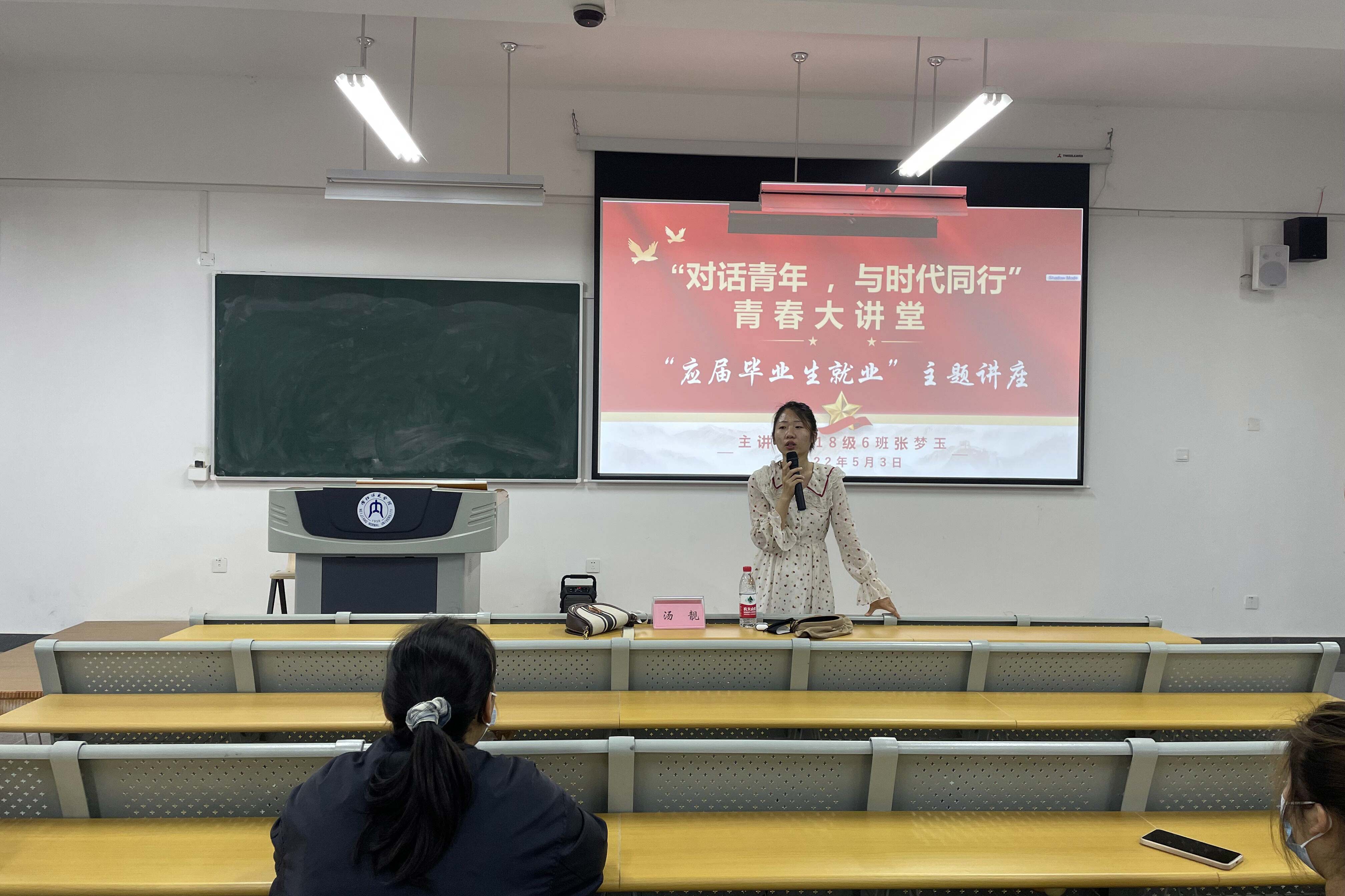 为帮助毕业生明晰就业形势,积极转变就业观念。5月3日晚上7点,公司于明德楼B区201教室开展第二期“对话青年,与时代同行”青春大讲堂——毕业生就业主题讲座,由2018级6班张梦玉同学作为主讲人,主持队韩佩珂担任主持人。此次主题讲座采用“线上线下”相结合的形式举办,公司辅导员汤靓老师,2018级全体同学和2019级部分同学参与了此次讲座。