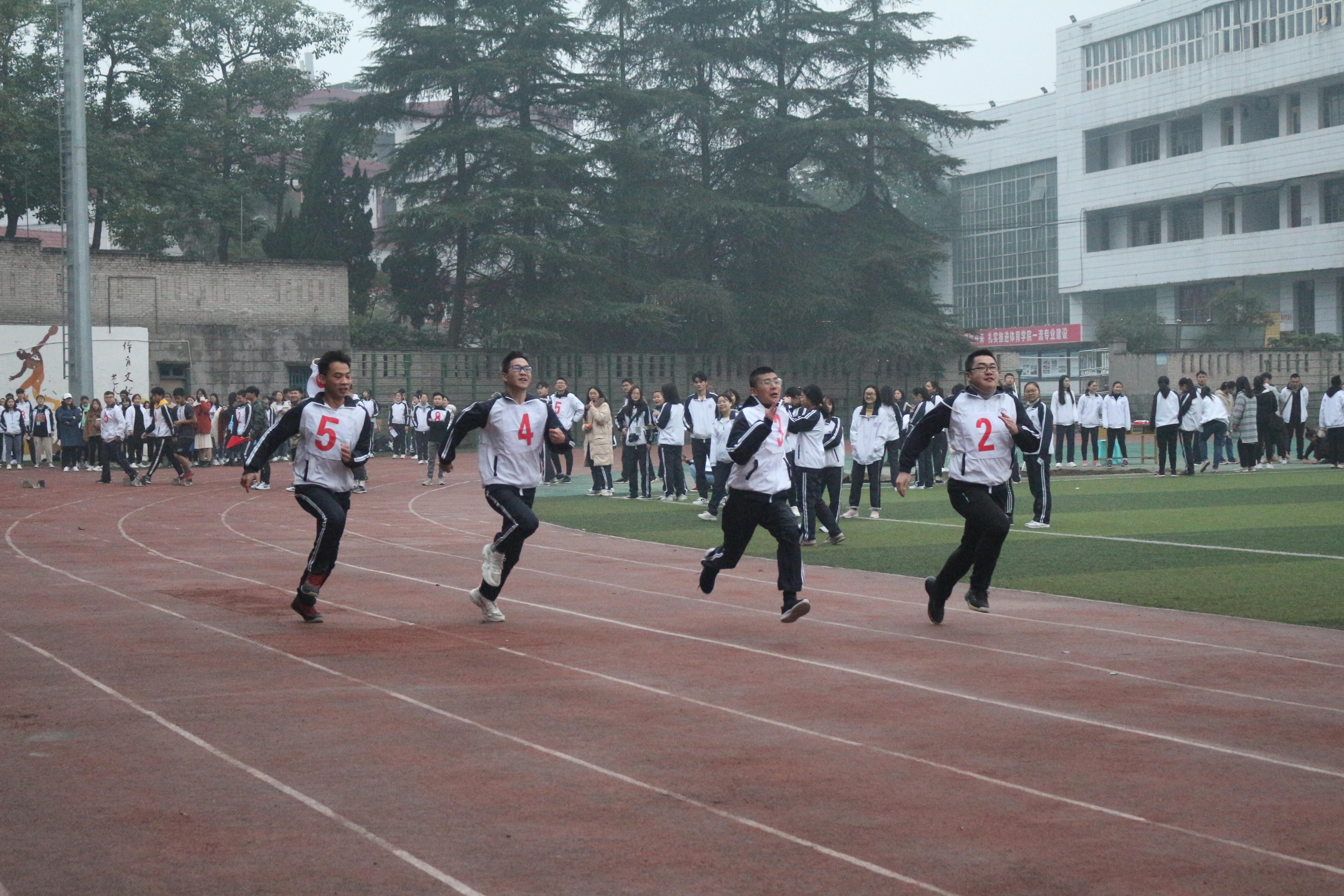 下午1点30分,冬阳正暖时,男子一百米决赛也拉开了序幕。有了上午的经验,他们更显从容,到达指定位置后各自做着准备运动。只见他们双手交叉,扭动着手部关节,左右脚依次提起然后转动。接收到裁判指示时,瞬间做好准备动作,微弯着腰部,抬头注视着前方,右脚向后,双手触底,只待口令声响便冲向终点。在哨声一出,红旗挥下时,他们便冲向终点。2018级1班甘国华更是一马当先,以12.40秒的优异成绩领先其他选手夺得此次比赛冠军,2019级5班徐海洋和2019级5班马鹏获得第二名和第三名的优异成绩。