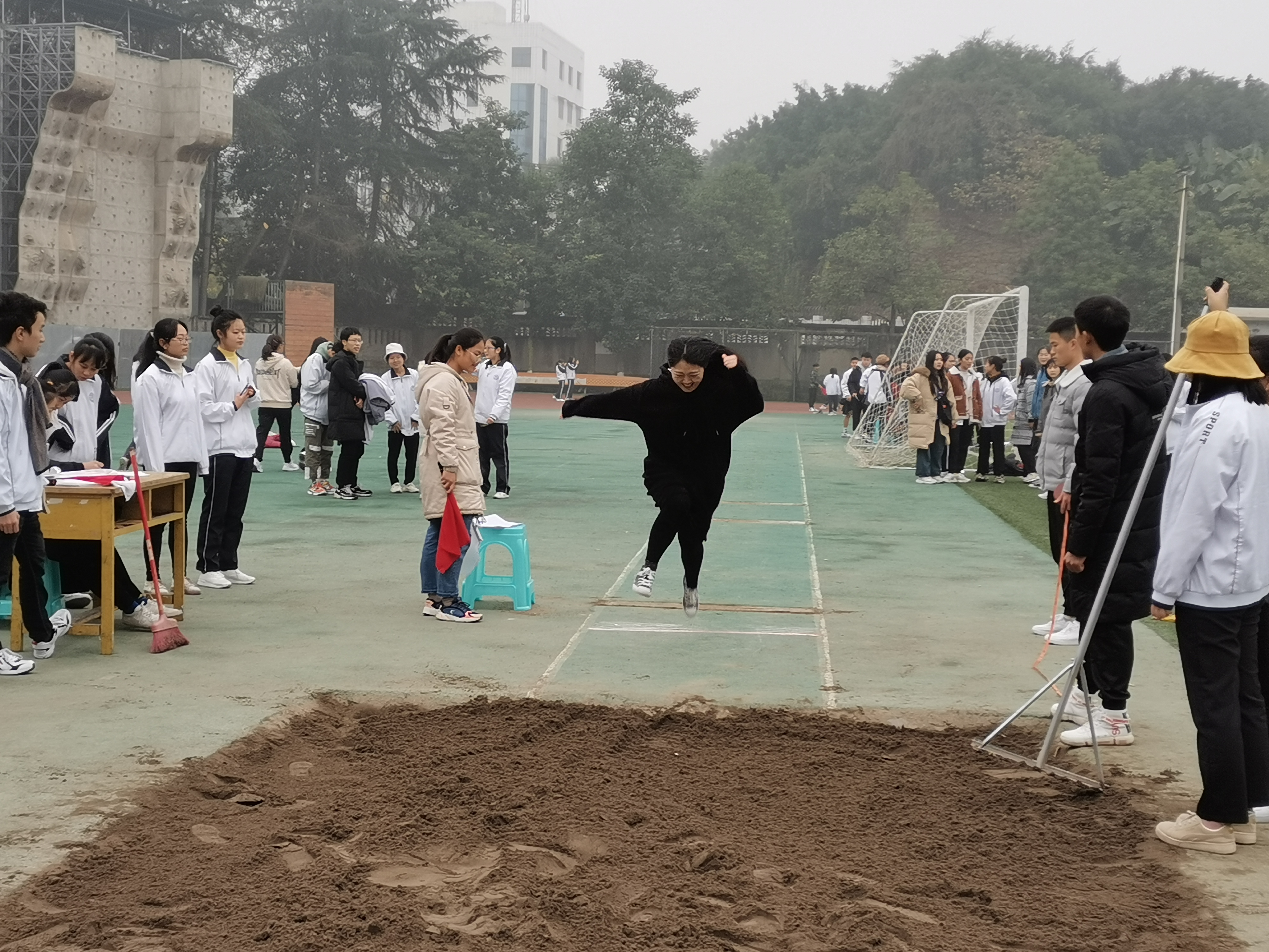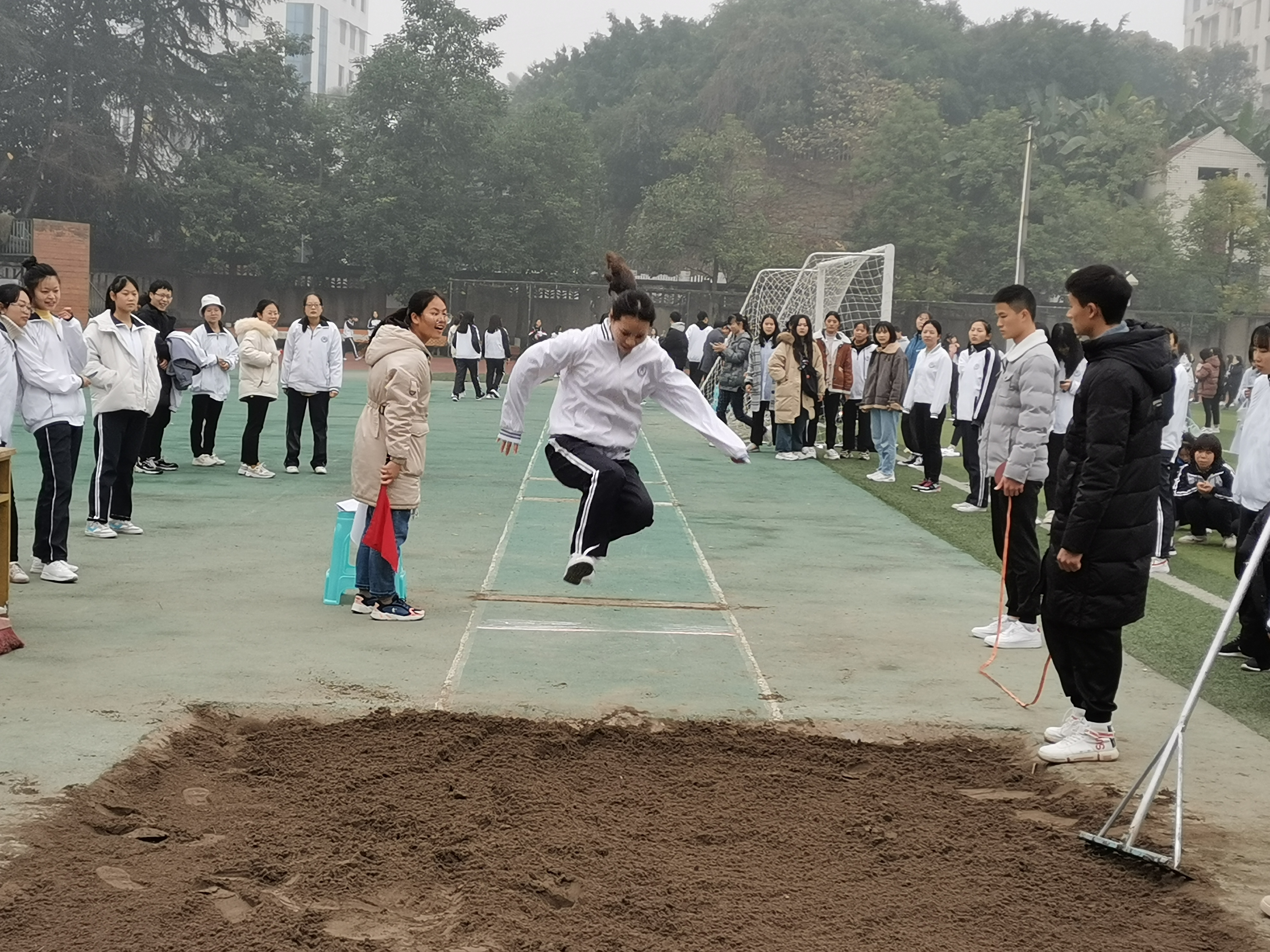 随着裁判有力地挥下红旗,比赛正式开始。参赛选手们像离弦的箭一样冲出助跑线,在起跳线前奋力一跃,轻盈的身姿在空中划出一道美丽的弧线,最终在深深的沙坑上留下自己的成绩。其中,2019级3班的冯于红同学虽然是第一次参加三级跳远比赛的“新手”,但每次助跑、跳跃都尽全全力,充分展现了公司学子永不言弃的拼搏精神。在10米奋力助跑的帮助下,2018级3班的文银英同学在第二次腾空一跃时在沙坑上留下了3米52的好成绩,并最终凭借这个好成绩获得了女子跳远比赛第一名。来自2018级5班、6班的鄢世花同学和范雅晴同学则以他们一气呵成的奋力助跑、蹬脚起跳、伸腿缩腿的流畅动作,分别取得了3米35和3米34的成绩,荣获了第二名和第三名。