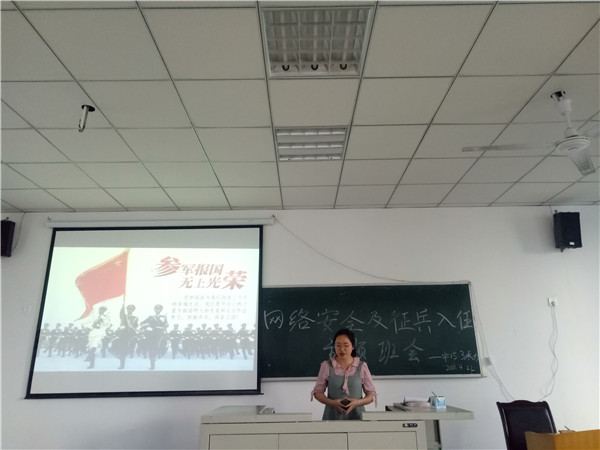 班会上,班主任就所有人最为关心的征兵的就学、就业、经济补助等方面政策进行了详细的解释说明。随后又向同学们介绍了2018年征兵工作的预征对象、身体条件等情况。接着又对之前同学们提出的有关学费减免、落户要求、复学助学等相关问题作出了回答,会场气氛十分热烈。最后,播放了相关视频——近几年的阅兵仪式,让同学们感受到作为一名兵人的骄傲与自豪,也让同学们了解到老员工入伍对于自身塑造和锻炼成才的重要意义,使同学们热血沸腾,达到了一定的宣传效果。