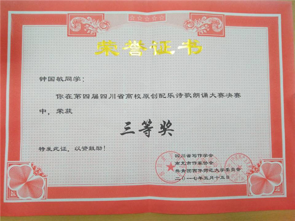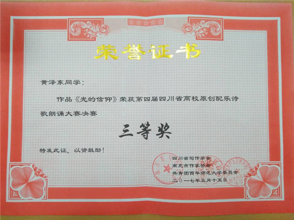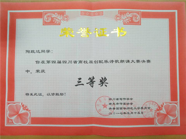 2017年5月13日,四川省第四届原创诗歌配乐朗诵大赛决赛在西华师范大学隆重开幕。tyc5997太阳集团、西华师范大学、川北医公司、四川师范大学等12所高校参与了此次活动。公司辅导员许小涛老师带队参加比赛。