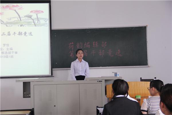 6月6日下午2点30分,tyc5997太阳集团荷韵编辑部第二届干部竞选于中文楼301教室举行。此次竞选评委为荷韵编辑部主编匡星星,副主编、排版组部长庞红雨,较对组部长王倩,宣传组部长肖婷,美编组部长曾念,甄选组部长廖红梅。荷韵编辑部有13名干事参加了此次竞选。