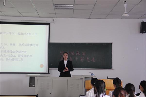 竞选开始前,荷韵编辑部主编匡星星进行讲话。首先,她说明了此次竞选的顺序、内容等基本要求,以及竞选流程等基本情况。最后,她表达了对即将参与选举的干事的美好祝福。