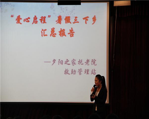第一支上场的团队是“爱心启程”服务队,团队指导老师是公司傅思忆老师。队长冯琳带领大家走进夕阳之家——托老院救助管理站。冯琳讲诉着养老院里面老人的情况,他们大多身患疾病,说话含糊不清。PPT上播放着冯琳团队在敬老院的爱心举动:为老人带去水果、剪脚趾甲、做饺子宴、和老人们聊天、帮助他们打扫卫生,虽然这些是家庭日常中很普通的行为,但是他们用自己满满的爱心将这些普通行为落在与自己毫无血缘关系的陌生老人身上,记录他们行为的一张张与老人的互动图片让现场不少观众眼圈湿润。