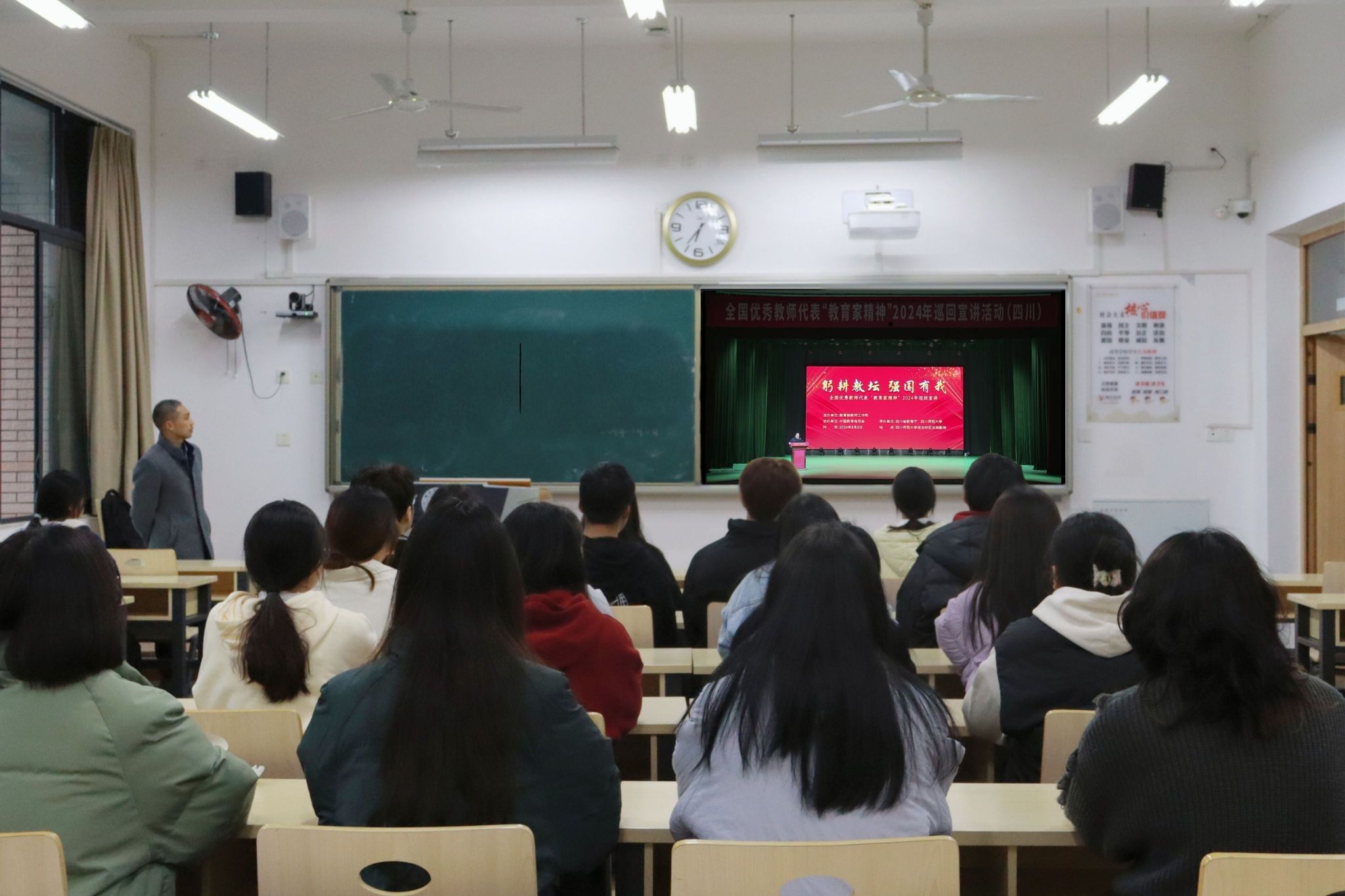 为深入贯彻落实习近平总书记关于弘扬教育学家精神的重要指示精神,传承和弘扬教育家的思想精髓,培育员工们的学习热情,3月7日晚上6点30分,公司组织员工于明德楼B区222教室观看了“躬耕教坛,强国有我”教育家精神2024年巡回宣讲。