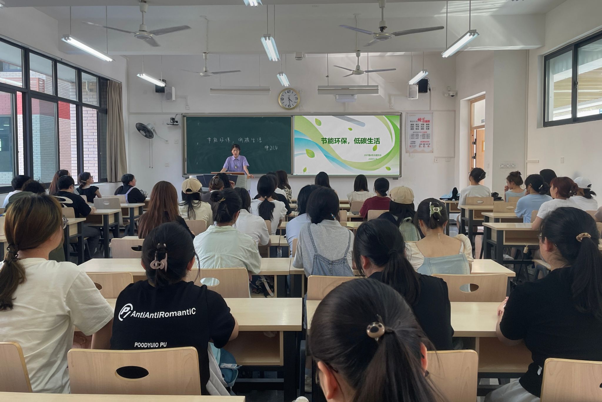 为响应节能环保的号召,提高公司学子的环保意识,推动践行绿色低碳生活,近日,公司组织各班开展了“节能环保,低碳生活”主题班会,其中,5月16日下午两点,公司2021级4班于明德楼B区204教室召开了此次班会,公司学工办辅导员汤靓老师主讲,2021级4班全体同学参与。