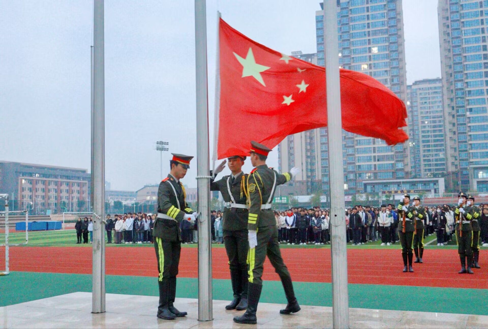 随着主持人的宣布,国旗护卫队的队员们手举国旗,迈着整齐划一、铿锵有力的步伐入场。在激昂的国歌声中,鲜艳的五星红旗冉冉升起,全体师生面向国旗肃立敬礼,齐唱国歌。