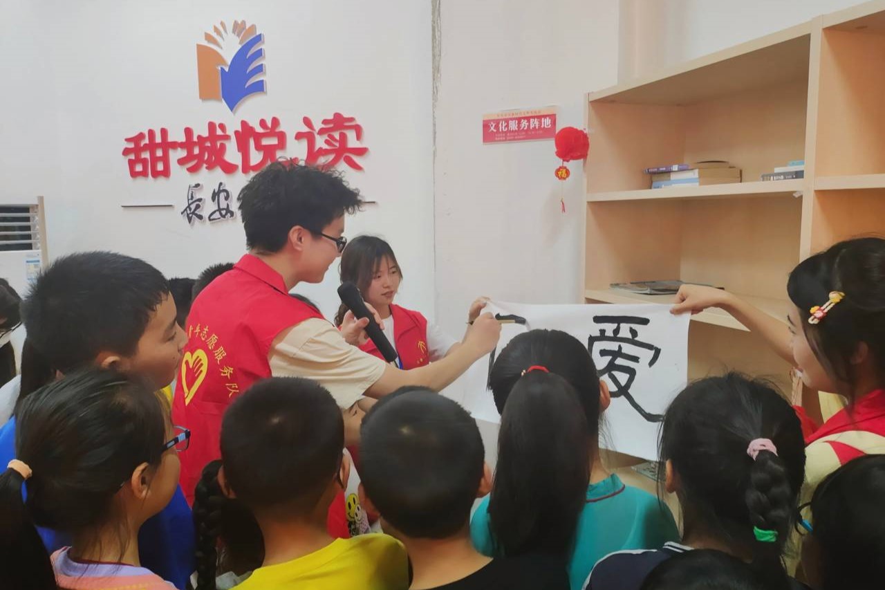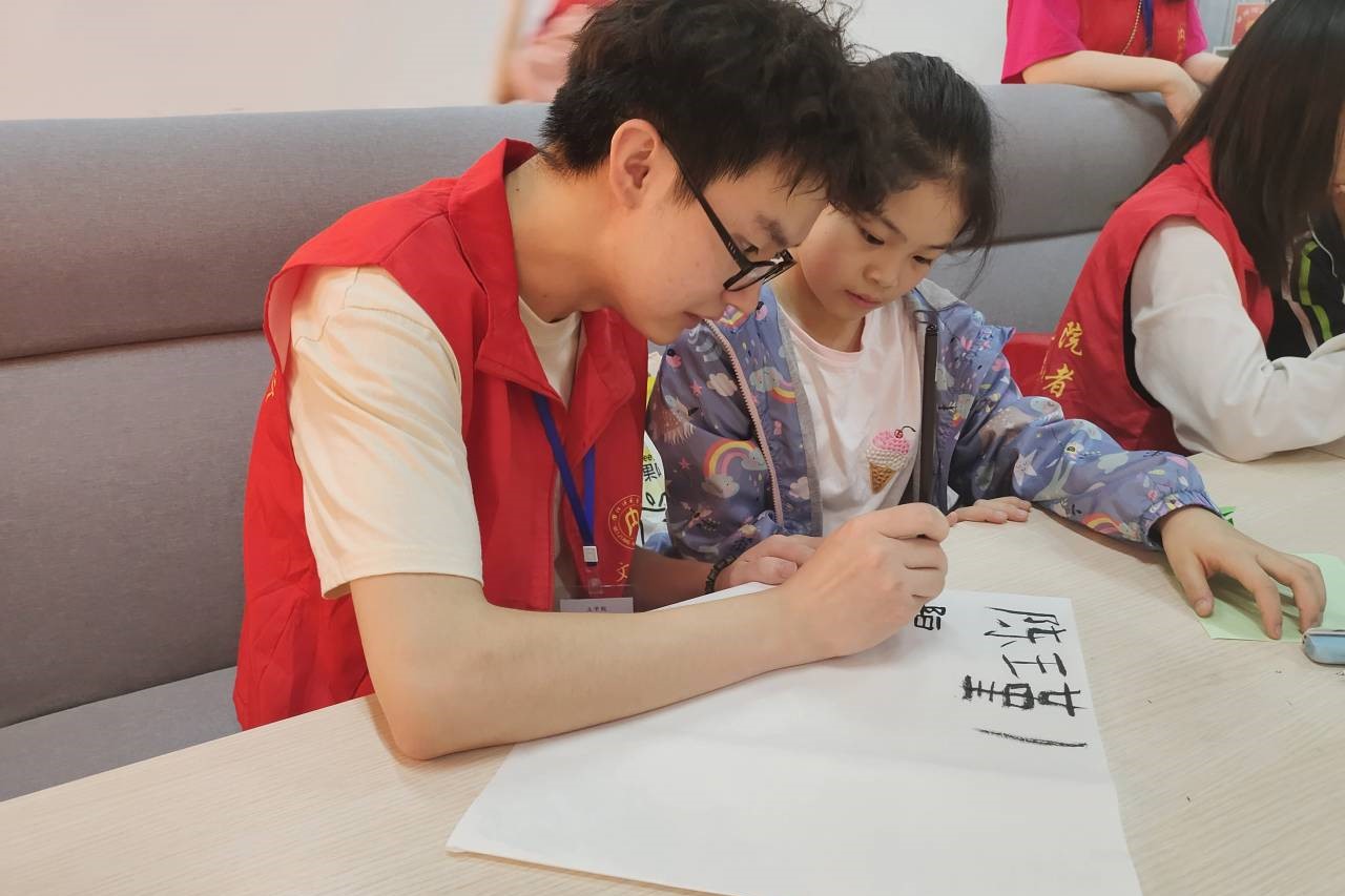 活动伊始,公司志愿者带领长安社区的小朋友们在活动区域落座,并教小朋友们做作业、折纸。在欢声笑语中,志愿者与小朋友们打成一片。随后,主持人刘星雨用爱国诗人竞答、爱国诗词问答等互动游戏引出本次活动的主题,小朋友们积极参与,竞相举手回答,气氛活跃热闹。然后,公司翰墨坊成员介绍了软笔书法、示范毛笔用法。接着,小朋友们在志愿者的指导下学习如何正确使用毛笔,并尝试用毛笔写字。新鲜的书法体验激发了小朋友们对中华优秀传统文化的热爱,使小朋友们专心投入其中。最后,本次活动在小朋友们的折纸作品、书法作品的展示中落下帷幕。