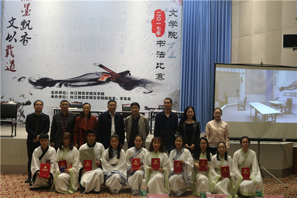 三轮比拼结束后,于军民老师上台进行了书法展示,将本次比赛推向了高潮。最终来自2016级3班的姚勇同学以86.87分夺得本次比赛的一等奖,李佳蒙、张媛媛获二等奖,赵洋、郑婷予、舒欣获三等奖,其余选手为优秀奖。现场,全体嘉宾和评委老师为他们颁发证书和奖品。