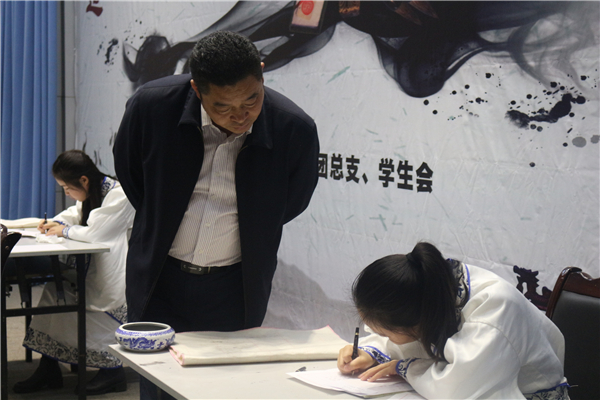 公司2017年书法大赛自9月底启动,面向全院学子,设初赛、决赛两个阶段。初赛期间,各班推荐优秀选手参与毛笔硬笔评稿以及粉笔现场书写的角逐,最终,10位选手脱颖而出,晋级决赛。他们分别是:2015级2班的张媛媛、郑婷予,2016级2班的赵璐,2016级3班的李佳蒙、姚勇,2016级8班的王茜、舒欣、王梓苏、王晨和2017级5班的赵洋。决赛设硬笔、粉笔、毛笔三轮现场比拼,集中考察选手的字架结构、笔画笔顺、书面整洁度、作品完成度等。三轮比赛总分100分,其中硬笔30分,粉笔30分,毛笔40分。决赛书写内容均由抽签决定,字体形式自选,10位选手每轮分两组上台比拼。硬笔和粉笔限时5分钟完成作品,毛笔限时8分钟。