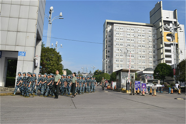 新生们在军训教官和辅导员的带领下,高擎连队番号、校旗,从西区大门出发,沿兰桂大道,汉安大道、兴隆路、大千路徒步行走。本次活动受到了校方的大力支持,并在医疗服务、交通等方面作了充足准备。拉练途中,为鼓舞士气,军训教官组织大家一路高唱军歌、高喊口号。同学们不畏路途遥远和天气炎热,始终保持着高昂的士气、饱满的热情,按照既定路线圆满完成了任务。