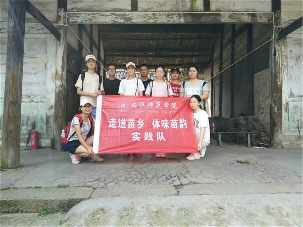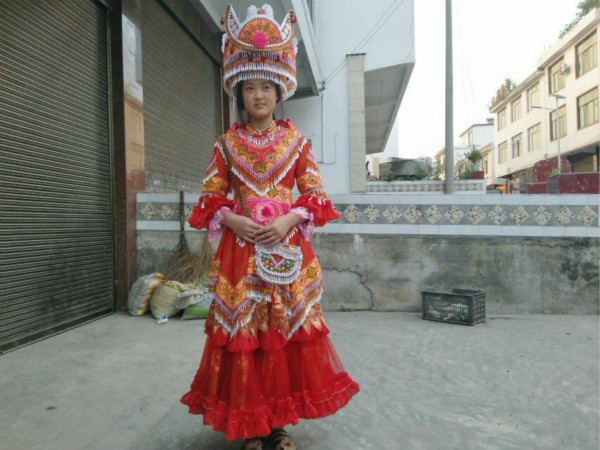 7月13日早上8点,实践队员们来到了一家前两年才从大山深处搬来县城的苗族人家。在采访过程中,实践队员们了解到苗族其实也存在贫穷与富裕两个层次,不少富裕人家基本上都是通过年轻人在外打工,老年人在家耕种抚养小孩而发家致富。今日采访的这家苗族人便是通过此种方式致富起来的,提起如何致富时,熊先生脸上布满了笑容。当问道是否适应大山外的世界时,熊先生表示:“刚出山的时候,由于语言不通,很少与周围的人交流。后来逐渐熟悉起来,有时一起开开玩笑,很快也就适应了大山外的生活。由于苗族人没多少的禁忌,对饮食方面的要求也很低,也能快速适应汉族人的生活习惯。”采访快接近尾声时,熊先生拿出了她妻子的一套喜服,颜色艳丽明亮,给人惊艳之感。实践队员还试穿了新娘装,体验了一下平日苗族服饰与汉族服饰的差别。